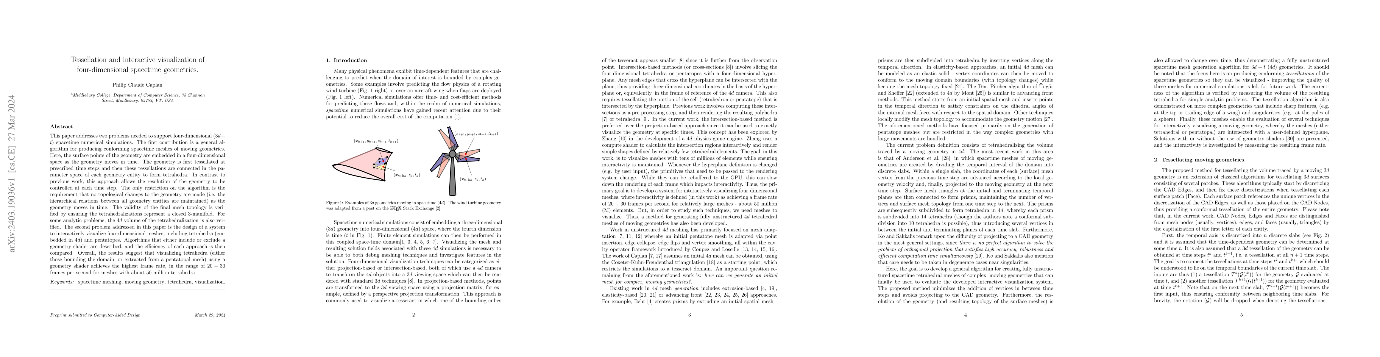 This paper addresses two problems needed to support four-dimensional ($3d + t$) spacetime numerical simulations. The first contribution is a general algorithm for producing conforming spacetime meshes of moving geometries. Here, the surface points of the geometry are embedded in a four-dimensional space as the geometry moves in time. The geometry is first tessellated at prescribed time steps and then these tessellations are connected in the parameter space of each geometry entity to form tetrahedra. In contrast to previous work, this approach allows the resolution of the geometry to be controlled at each time step. The only restriction on the algorithm is the requirement that no topological changes to the geometry are made (i.e. the hierarchical relations between all geometry entities are maintained) as the geometry moves in time. The validity of the final mesh topology is verified by ensuring the tetrahedralizations represent a closed 3-manifold. For some analytic problems, the $4d$ volume of the tetrahedralization is also verified. The second problem addressed in this paper is the design of a system to interactively visualize four-dimensional meshes, including tetrahedra (embedded in $4d$) and pentatopes. Algorithms that either include or exclude a geometry shader are described, and the efficiency of each approach is then compared. Overall, the results suggest that visualizing tetrahedra (either those bounding the domain, or extracted from a pentatopal mesh) using a geometry shader achieves the highest frame rate, in the range of $20-30$ frames per second for meshes with about $50$ million tetrahedra.