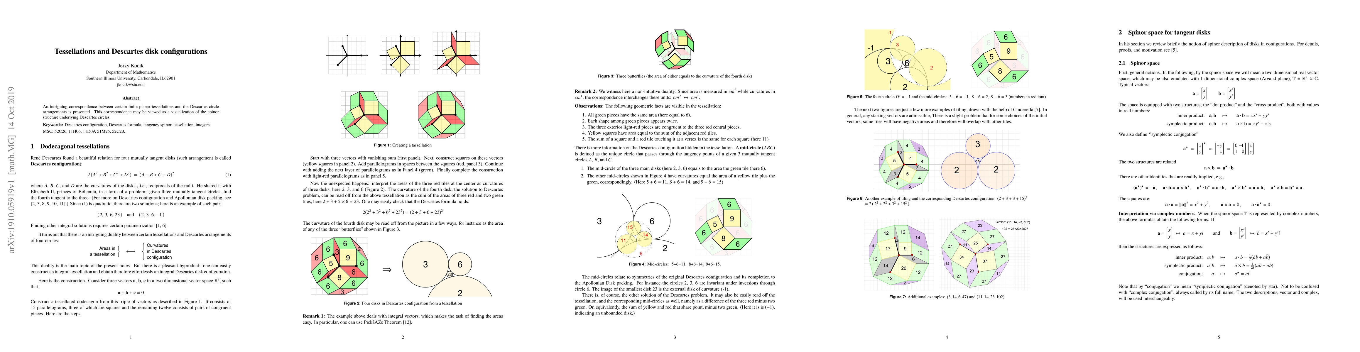 Summary: The paper explores a fascinating link between specific planar tessellations and Descartes circle arrangements, offering a visual representation of the spinor structure inherent in Descartes circles. This correspondence provides new insights into both geometric configurations.