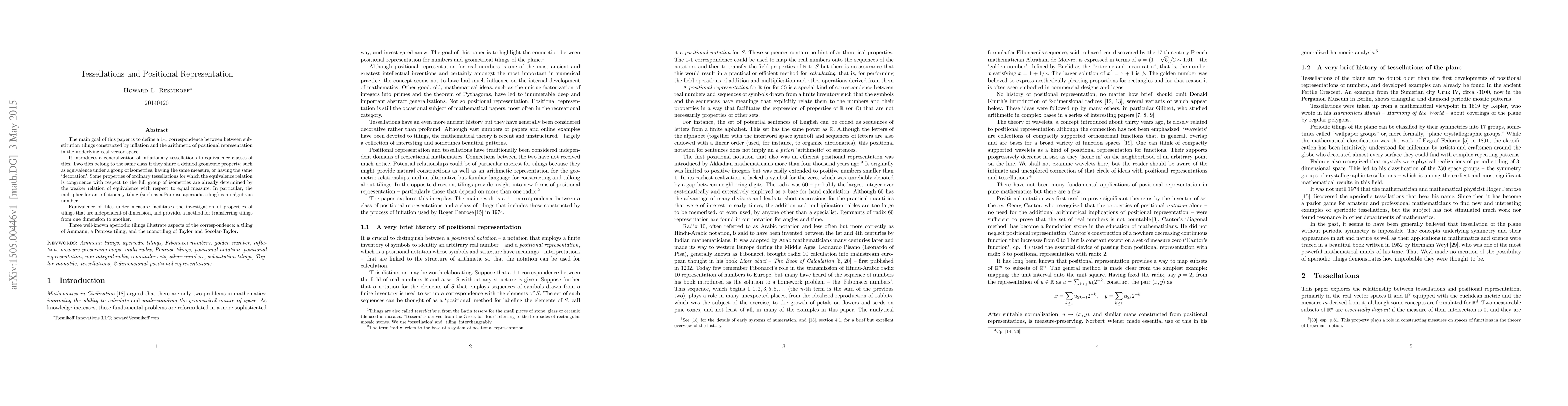 The main goal of this paper is to define a 1-1 correspondence between between substitution tilings constructed by inflation and the arithmetic of positional representation in the underlying real vector space. It introduces a generalization of inflationary tessellations to equivalence classes of tiles. Two tiles belong to the same class if they share a defined geometric property, such as equivalence under a group of isometries, having the same measure, or having the same `decoration'. Some properties of ordinary tessellations for which the equivalence relation is congruence with respect to the full group of isometries are already determined by the weaker relation of equivalence with respect to equal measure. In particular, the multiplier for an inflationary tiling (such as a Penrose aperiodic tiling) is an algebraic number. Equivalence of tiles under measure facilitates the investigation of properties of tilings that are independent of dimension, and provides a method for transferring tilings from one dimension to another. Three well-known aperiodic tilings illustrate aspects of the correspondence: a tiling of Ammann, a Penrose tiling, and the monotiling of Taylor and Socolar-Taylor.