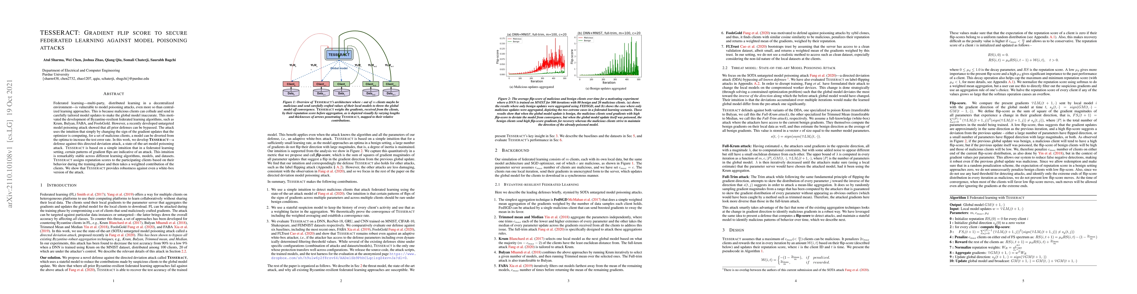 TESSERACT defends federated learning against model poisoning attacks by identifying and mitigating gradient flip manipulations, assigning reputation scores to clients, and weighting their contributions to training based on this scoring system, demonstrating robustness against both targeted and white-box attacks.