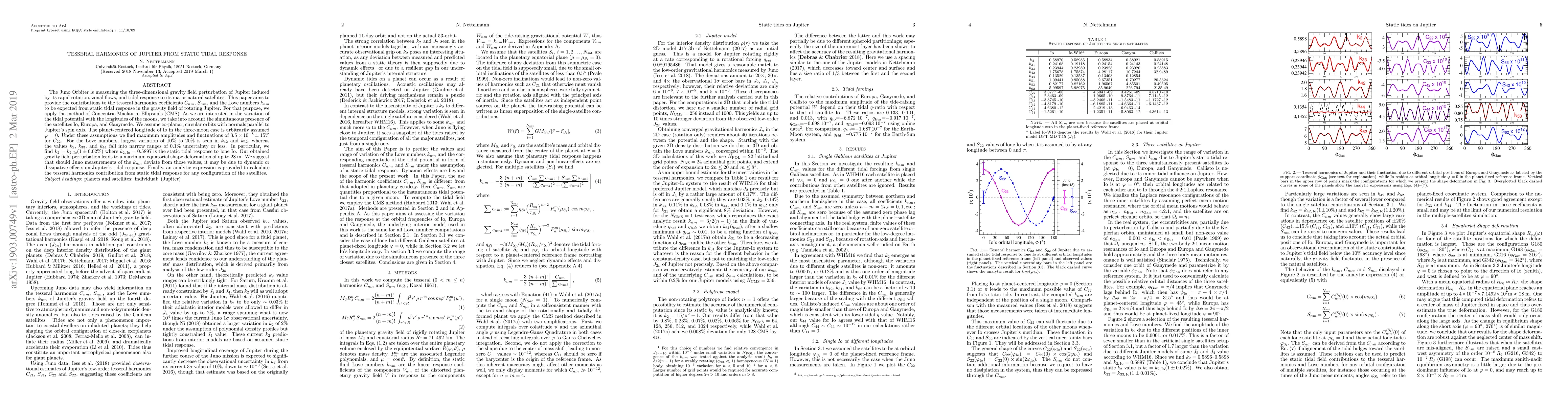 The Juno Orbiter is measuring the three-dimensional gravity field perturbation of Jupiter induced by its rapid rotation, zonal flows, and tidal response to its major natural satellites. This paper aims to provide the contributions to the tesseral harmonics coefficients Cnm, Snm, and the Love numbers knm to be expected from static tidal response in the gravity field of rotating Jupiter. For that purpose, we apply the method of Concentric Maclaurin Ellipsoids (CMS). As we are interested in the variation of the tidal potential with the longitudes of the moons, we take into account the simultaneous presence of the satellites Io, Europa, and Ganymede. We assume co-planar, circular orbits with normals parallel to Jupiter's spin axis. The planet-centered longitude of Io in the three-moon case is arbitrarily assumed varphi = 0. Under these assumptions we find maximum amplitudes and fluctuations of 3.5 times 10^-8 +- 15% for C22. For the Love numbers, largest variation of 10% to 20% is seen in k42 and k62, whereas the values k2, k33, and k44 fall into narrow ranges of 0.1% uncertainty or less. In particular, we find k2=k2,Io(1 +- 0.02%) where k2,Io=0.5897 is the static tidal response to lone Io. Our obtained gravity field perturbation leads to a maximum equatorial shape deformation of up to 28m. We suggest that should Juno measurements of the knm deviate from those values, it may be due to dynamic or dissipative effects on Jupiter's tidal response. Finally, an analytic expression is provided to calculate the tesseral harmonics contribution from static tidal response for any configuration of the satellites.