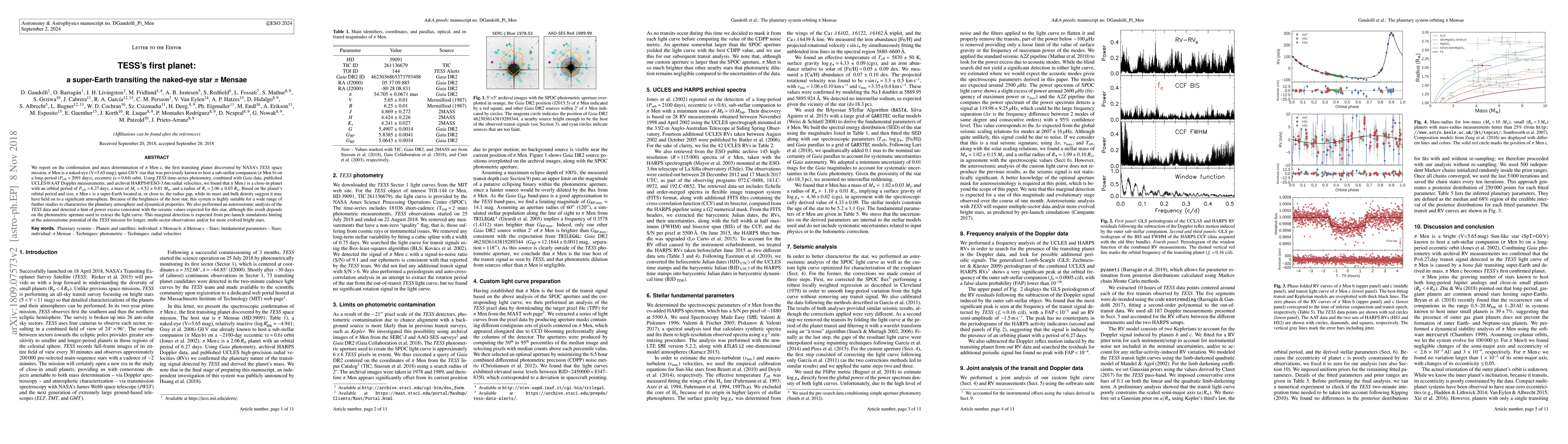 The first planet discovered by NASA's TESS mission, Pi Men c, is a super-Earth transiting the bright G0 V star Pi Mensae. This planet has an orbital period of 6.27 days, a mass of 4.52 MEarth, and a radius of 2.06 REarth, making it a prime candidate for atmospheric studies due to its proximity to the radius gap.