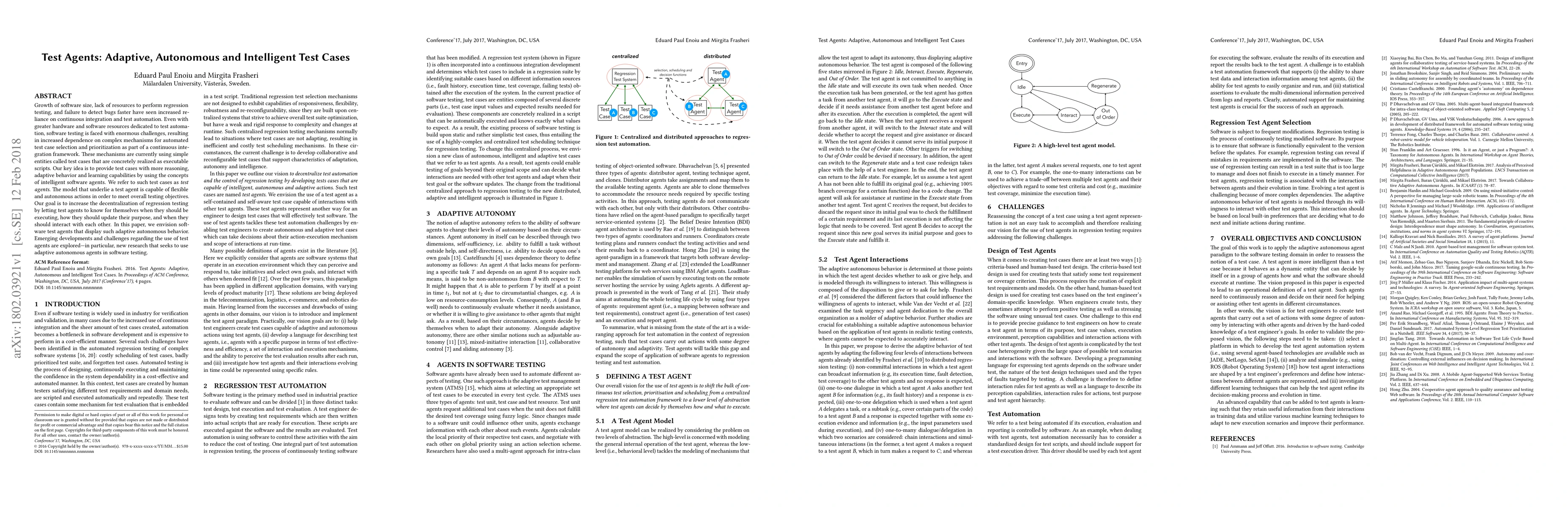 Growth of software size, lack of resources to perform regression testing, and failure to detect bugs faster have seen increased reliance on continuous integration and test automation. Even with greater hardware and software resources dedicated to test automation, software testing is faced with enormous challenges, resulting in increased dependence on complex mechanisms for automated test case selection and prioritization as part of a continuous integration framework. These mechanisms are currently using simple entities called test cases that are concretely realized as executable scripts. Our key idea is to provide test cases with more reasoning, adaptive behavior and learning capabilities by using the concepts of intelligent software agents. We refer to such test cases as test agents. The model that underlie a test agent is capable of flexible and autonomous actions in order to meet overall testing objectives. Our goal is to increase the decentralization of regression testing by letting test agents to know for themselves when they should be executing, how they should update their purpose, and when they should interact with each other. In this paper, we envision software test agents that display such adaptive autonomous behavior. Emerging developments and challenges regarding the use of test agents are explored-in particular, new research that seeks to use adaptive autonomous agents in software testing.