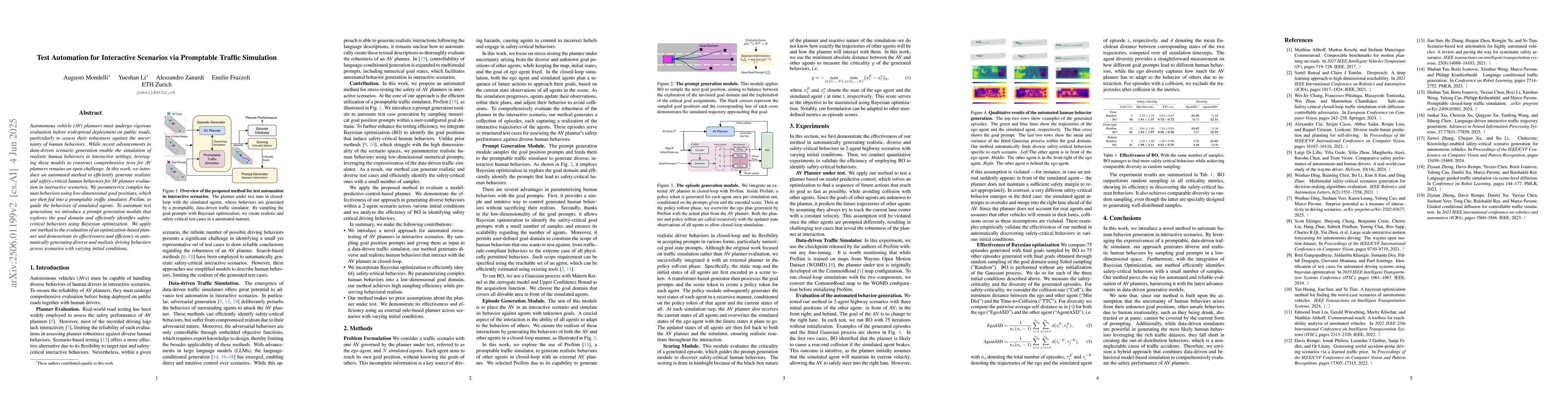 The research introduces a method using a promptable traffic simulator, ProSim, to parameterize complex human behaviors with low-dimensional goal positions. A prompt generation module explores the goal domain and identifies safety-critical behaviors via Bayesian optimization for automated test generation of AV planners.