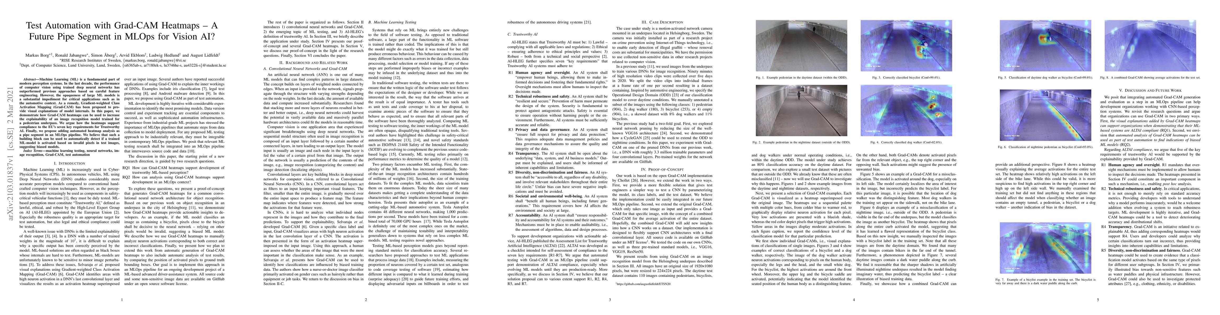 Machine Learning (ML) is a fundamental part of modern perception systems. In the last decade, the performance of computer vision using trained deep neural networks has outperformed previous approaches based on careful feature engineering. However, the opaqueness of large ML models is a substantial impediment for critical applications such as in the automotive context. As a remedy, Gradient-weighted Class Activation Mapping (Grad-CAM) has been proposed to provide visual explanations of model internals. In this paper, we demonstrate how Grad-CAM heatmaps can be used to increase the explainability of an image recognition model trained for a pedestrian underpass. We argue how the heatmaps support compliance to the EU's seven key requirements for Trustworthy AI. Finally, we propose adding automated heatmap analysis as a pipe segment in an MLOps pipeline. We believe that such a building block can be used to automatically detect if a trained ML-model is activated based on invalid pixels in test images, suggesting biased models.