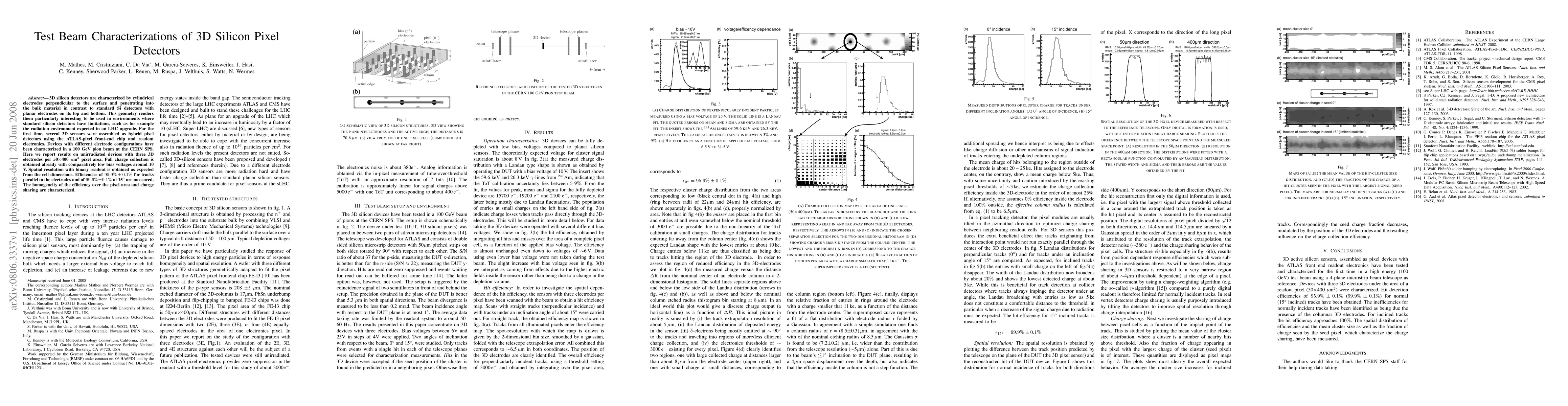 This paper reports on the characterization of 3D silicon pixel detectors with cylindrical electrodes in a 100 GeV pion beam, demonstrating full charge collection at low bias voltages and high track detection efficiencies, with 95.9% and 99.9% for parallel and oblique tracks respectively.