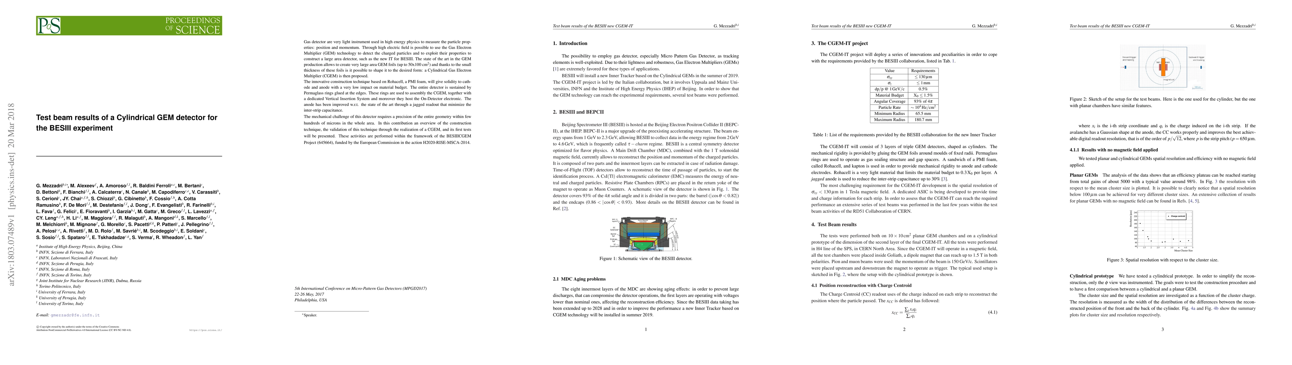 Gas detector are very light instrument used in high energy physics to measure the particle properties: position and momentum. Through high electric field is possible to use the Gas Electron Multiplier (GEM) technology to detect the charged particles and to exploit their properties to construct a large area detector, such as the new IT for BESIII. The state of the art in the GEM production allows to create very large area GEM foils (up to 50x100 $\mathrm{cm}^2$) and thanks to the small thickness of these foils is it possible to shape it to the desired form: a Cylindrical Gas Electron Multiplier (CGEM) is then proposed. The innovative construction technique based on Rohacell, a PMI foam, will give solidity to cathode and anode with a very low impact on material budget. The entire detector is sustained by Permaglass rings glued at the edges. These rings are used to assembly the CGEM, together with a dedicated Vertical Insertion System and moreover they host the On-Detector electronic. The anode has been improved w.r.t. the state of the art through a jagged readout that minimize the inter-strip capacitance. The mechanical challenge of this detector requires a precision of the entire geometry within few hundreds of microns in the whole area. In this contribution an overview of the construction technique, the validation of this technique through the realization of a CGEM, and its first tests will be presented. These activities are performed within the framework of the BESIIICGEM Project (645664), funded by the European Commission in the action H2020-RISE-MSCA-2014.