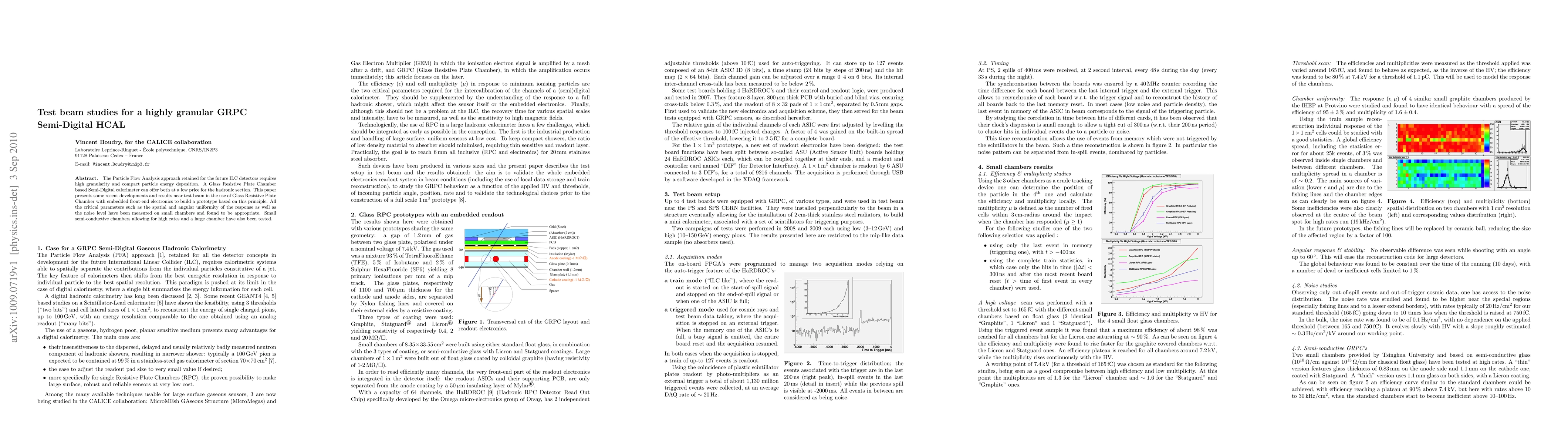 This paper reports on test beam studies for a prototype highly granular Glass Resistive Plate Chamber (GRPC) Semi-Digital Hadronic Calorimeter (HCAL) designed for future ILC detectors, demonstrating favorable spatial, angular uniformity, and noise performance. The study also tests small and large semi-conductive chambers for high-rate operation.