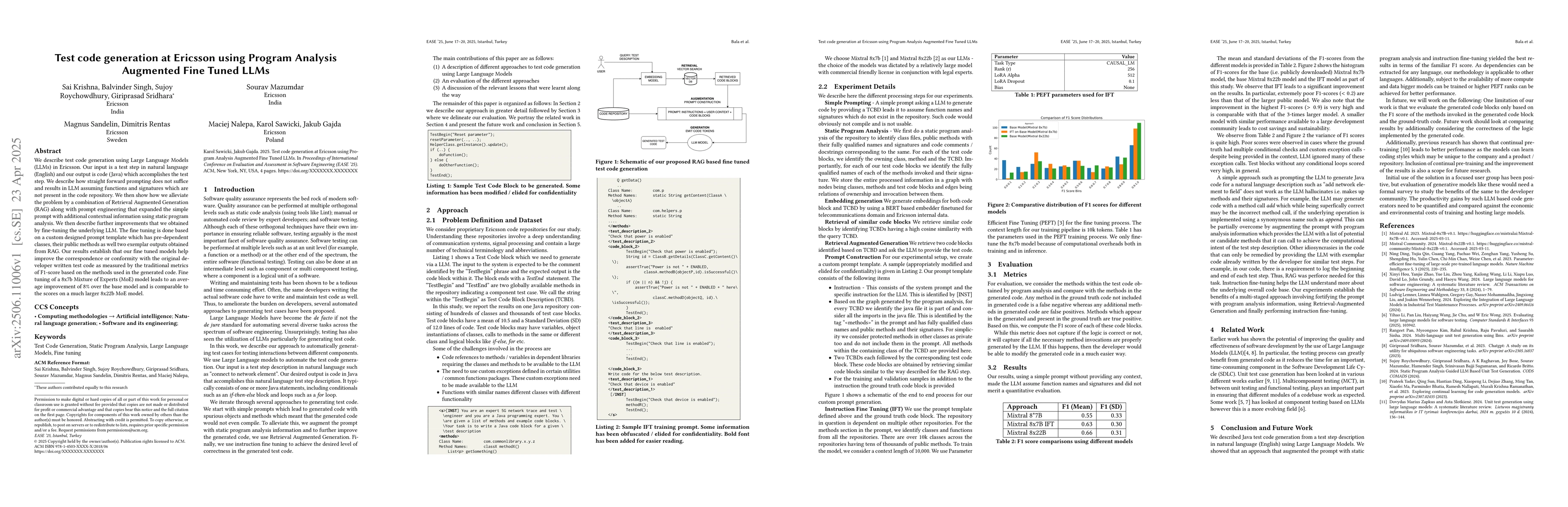 We describe test code generation using Large Language Models (LLMs) in Ericsson. Our input is a test step in natural language (English) and our output is code (Java) which accomplishes the test step. We describe how straight forward prompting does not suffice and results in LLM assuming functions and signatures which are not present in the code repository. We then show how we alleviate the problem by a combination of Retrieval Augmented Generation (RAG) along with prompt engineering that expanded the simple prompt with additional contextual information using static program analysis. We then describe further improvements that we obtained by fine-tuning the underlying LLM. The fine tuning is done based on a custom designed prompt template which has pre-dependent classes, their public methods as well two exemplar outputs obtained from RAG. Our results establish that our fine tuned models help improve the correspondence or conformity with the original developer written test code as measured by the traditional metrics of F1-score based on the methods used in the generated code. Fine tuning of a 8x7b Mixture of Experts (MoE) model leads to an average improvement of 8\% over the base model and is comparable to the scores on a much larger 8x22b MoE model.