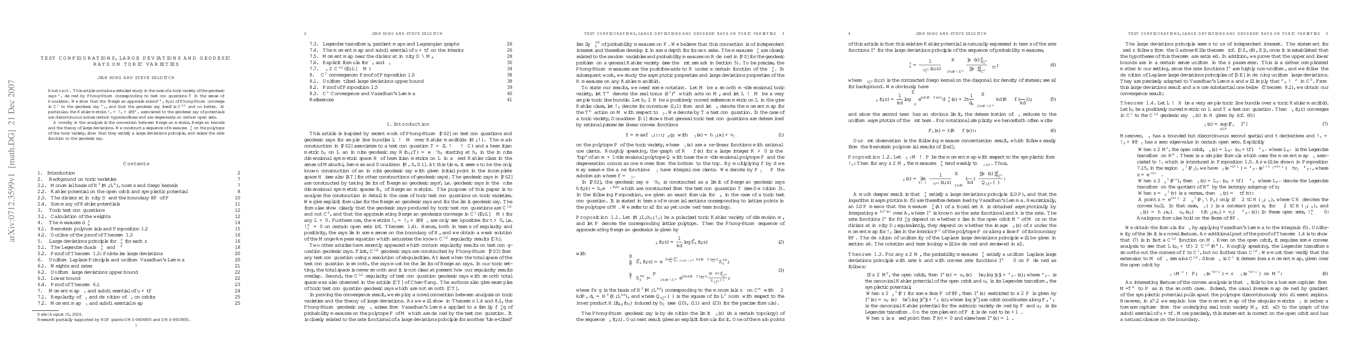 Researchers study geodesic rays on toric varieties, showing they converge to a C^1 limit and have certain properties in relation to Kahler metrics and large deviations.