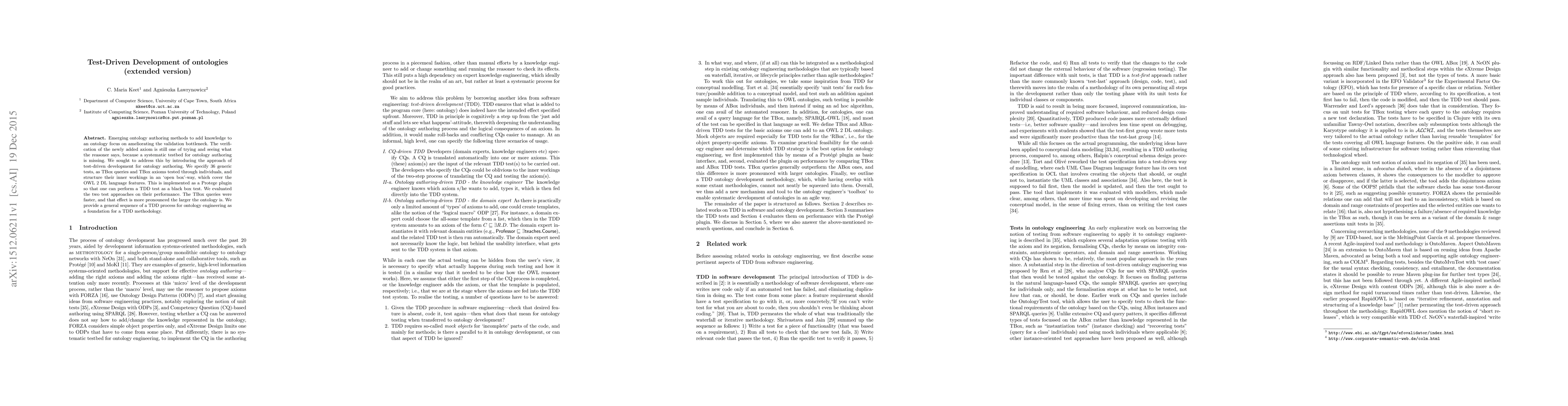 This paper introduces a test-driven development (TDD) approach for ontology authoring to address the validation bottleneck, specifying 36 generic tests implemented as a Protege plugin. The study found that TBox queries performed faster, especially in larger ontologies, and provides a foundational sequence for a TDD methodology in ontology engineering.