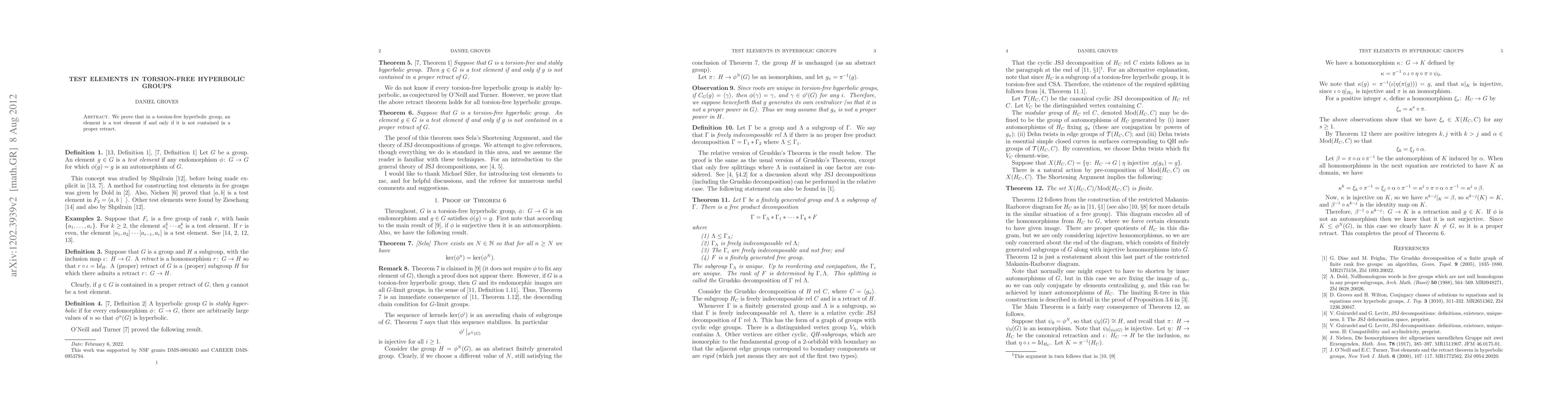 We prove that in a torsion-free hyperbolic group, an element is a test element if and only if it is not contained in a proper retract.