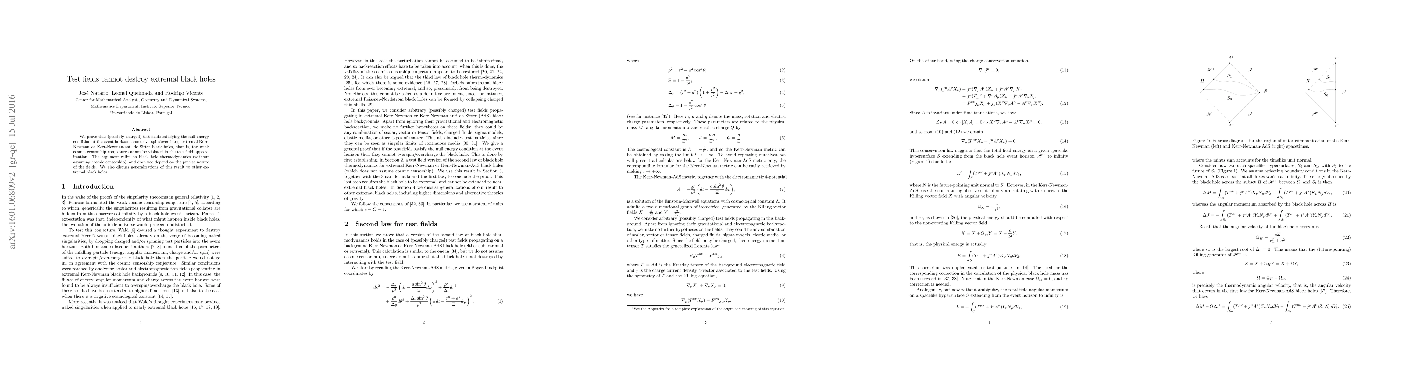 We prove that (possibly charged) test fields satisfying the null energy condition at the event horizon cannot overspin/overcharge extremal Kerr-Newman or Kerr-Newman-anti de Sitter black holes, that is, the weak cosmic censorship conjecture cannot be violated in the test field approximation. The argument relies on black hole thermodynamics (without assuming cosmic censorship), and does not depend on the precise nature of the fields. We also discuss generalizations of this result to other extremal black holes.