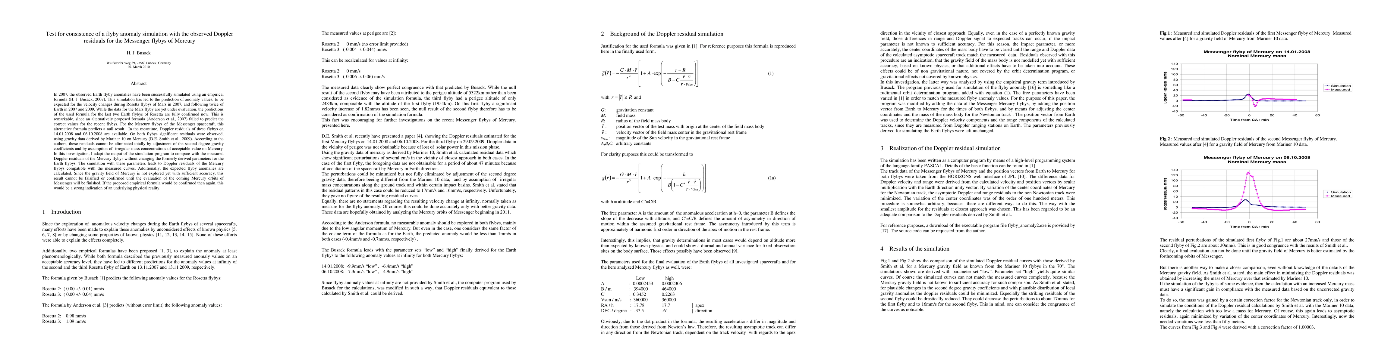 In 2007, the observed Earth flyby anomalies have been successfully simulated using an empirical formula (H. J. Busack, 2007). This simulation has led to the prediction of anomaly values, to be expected for the Rosetta flybys of Mars in 2007, and following twice of Earth in 2007 and 2009. While the data for the Mars flyby are yet under evaluation, the predictions of the formula for the last two Earth flybys of Rosetta are fully confirmed now. This is remarkable, since an alternatively proposed formula (Anderson et al., 2007) failed to predict the correct values for the recent flybys. For the Mercury flybys of the Messenger spacecraft, this alternative formula predicts a null result. In the meantime, Doppler residuals of these flybys on 14.01.2008 and 06.10.2008 are availabel. On both flybys, significant residuals were observed, using gravity data derived by Mariner 10 on Mercury (D. E. Smith et al., 2009). According to the authors, these residuals cannot be eliminated totally by adjustment of the second degree gravity coefficients and by assumption of irregular mass concentrations of acceptable value on Mercury. In this investigation, I adapt the output of the simulation program to compare with the measured Doppler residuals of the Mercury flybys without changing the formerly derived parameters for the Earth flybys. The simulation with these parameters leads to Doppler residuals of the Mercury flybys compatible with the measured curves. Additionally, the expected flyby anomalies are calculated. Since the gravity field of Mercury is not explored yet with sufficient accuracy, this result cannot be falsified or confirmed until the evaluation of the coming Mercury orbits of Messenger will be finished. If the proposed empirical formula would be confirmed then again, this would be a strong indication of an underlying physical reality.