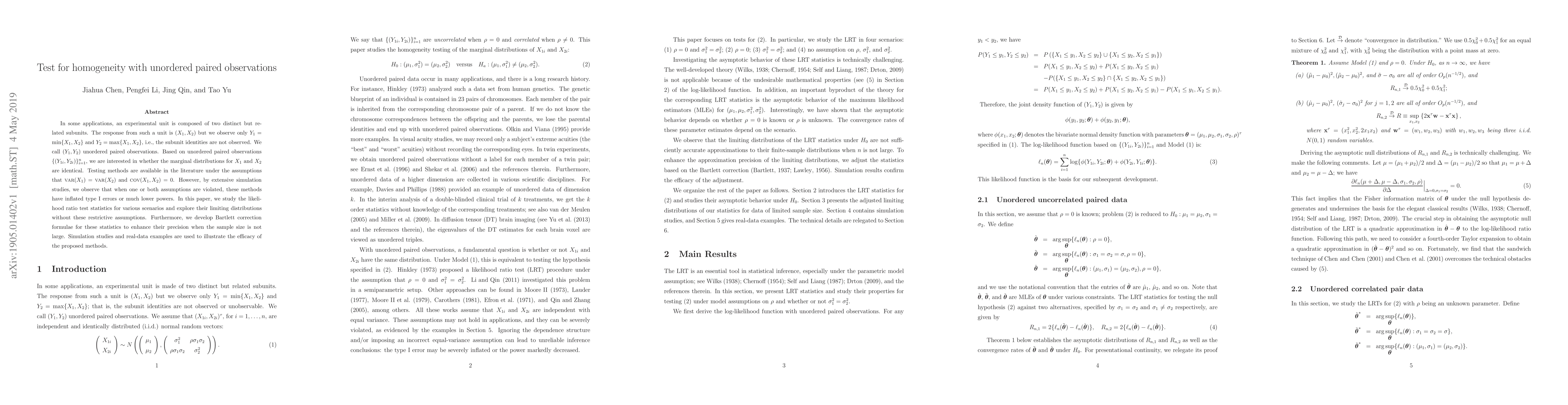 In some applications, an experimental unit is composed of two distinct but related subunits. The response from such a unit is $(X_{1}, X_{2})$ but we observe only $Y_1 = \min\{X_{1},X_{2}\}$ and $Y_2 = \max\{X_{1},X_{2}\}$, i.e., the subunit identities are not observed. We call $(Y_1, Y_2)$ unordered paired observations. Based on unordered paired observations $\{(Y_{1i}, Y_{2i})\}_{i=1}^n$, we are interested in whether the marginal distributions for $X_1$ and $X_2$ are identical. Testing methods are available in the literature under the assumptions that $Var(X_1) = Var(X_2)$ and $Cov(X_1, X_2) = 0$. However, by extensive simulation studies, we observe that when one or both assumptions are violated, these methods have inflated type I errors or much lower powers. In this paper, we study the likelihood ratio test statistics for various scenarios and explore their limiting distributions without these restrictive assumptions. Furthermore, we develop Bartlett correction formulae for these statistics to enhance their precision when the sample size is not large. Simulation studies and real-data examples are used to illustrate the efficacy of the proposed methods.