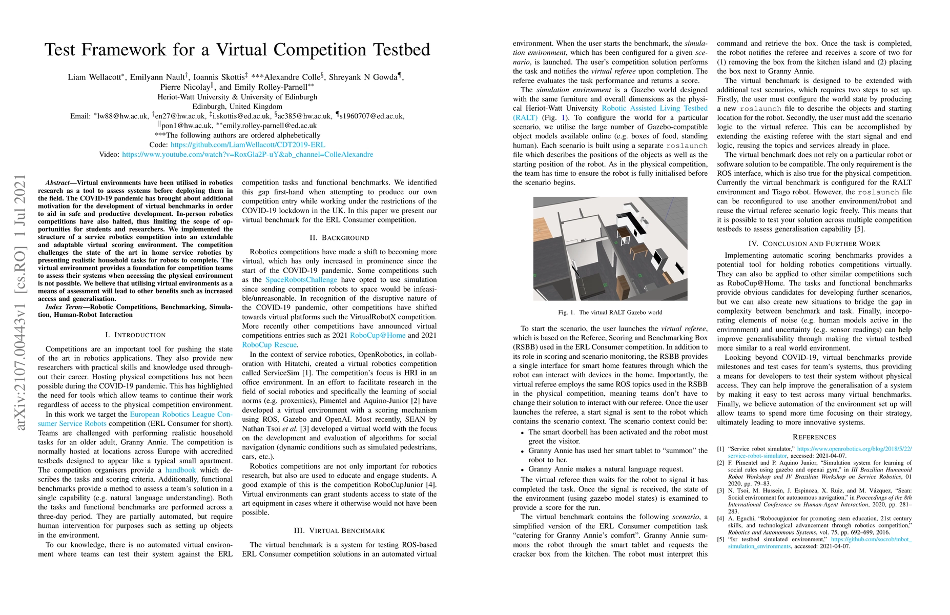 Virtual environments have been utilised in robotics research as a tool to assess systems before deploying them in the field. The COVID-19 pandemic has brought about additional motivation for the development of virtual benchmarks in order to aid in safe and productive development. In-person robotics competitions have also halted, thus limiting the scope of opportunities for students and researchers. We implemented the structure of a service robotics competition into an extendable and adaptable virtual scoring environment. The competition challenges the state of the art in home service robotics by presenting realistic household tasks for robots to complete. The virtual environment provides a foundation for competition teams to assess their systems when accessing the physical environment is not possible. We believe that utilising virtual environments as a means of assessment will lead to other benefits such as increased access and generalisation.