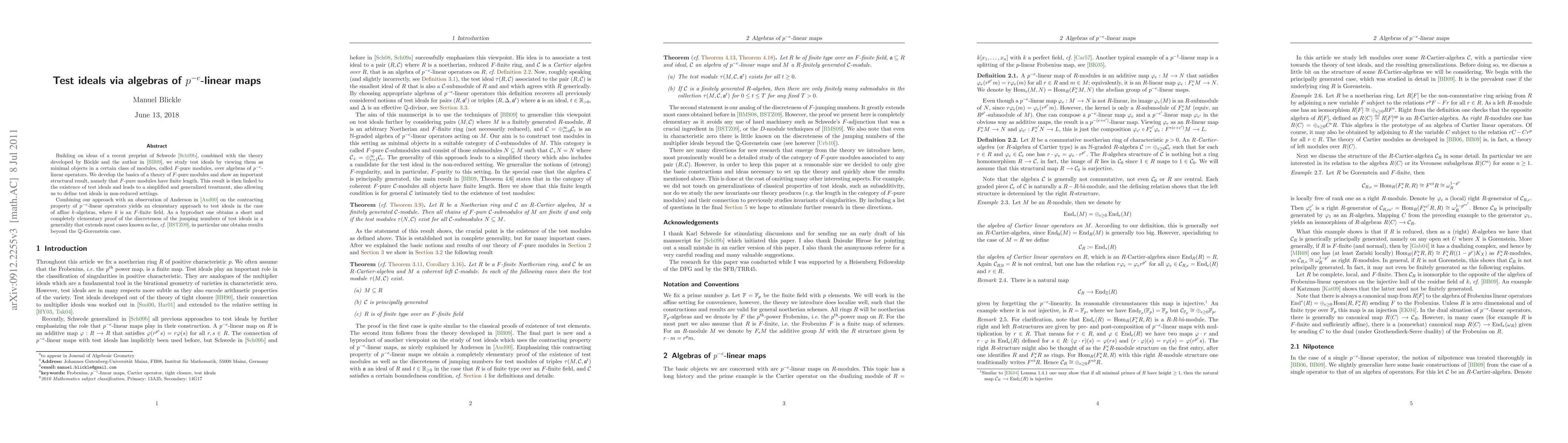 This paper explores test ideals through $F$-pure modules over algebras of $p^{-e}$-linear maps, providing a simplified and generalized framework that extends to non-reduced settings. It leverages an elementary approach to define test ideals for affine $k$-algebras over $F$-finite fields and proves the discreteness of their jumping numbers.