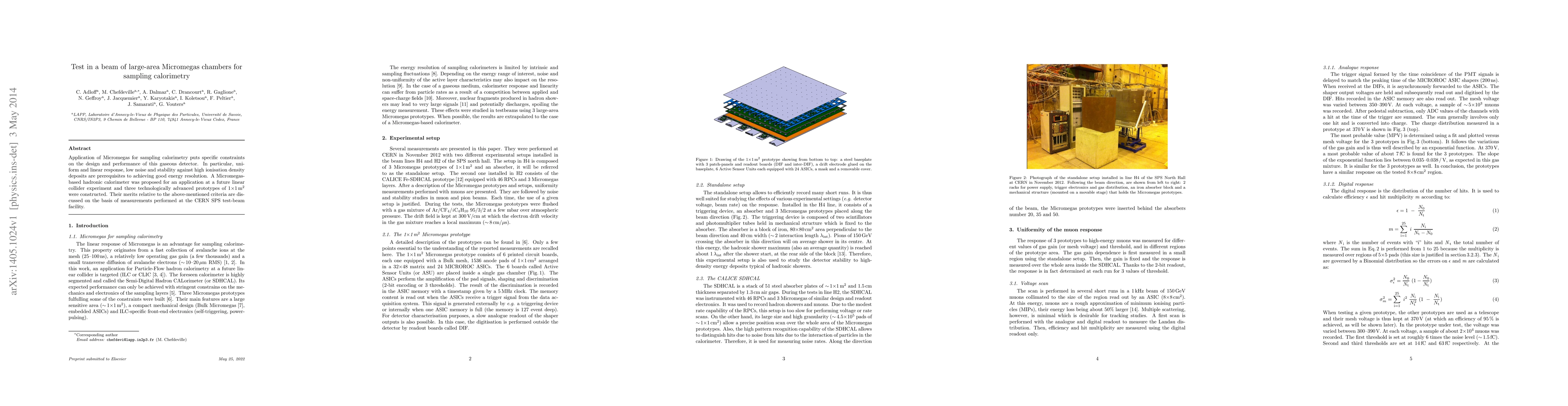 This paper evaluates the performance of large-area Micromegas chambers for sampling calorimetry, focusing on their uniform response, low noise, and stability under high ionization. The study tests three advanced 1$\times$1 m$^{2}$ prototypes at CERN SPS, assessing their suitability for a future linear collider experiment.