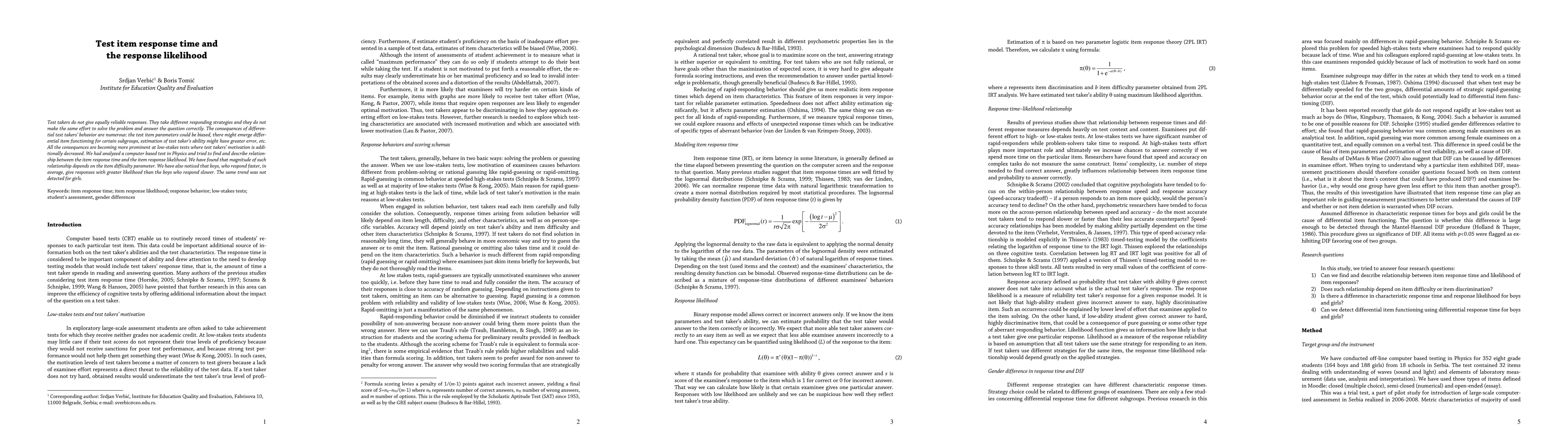 Test takers do not give equally reliable responses. They take different responding strategies and they do not make the same effort to solve the problem and answer the question correctly. The consequences of differential test takers' behavior are numerous: the test item parameters could be biased, there might emerge differential item functioning for certain subgroups, estimation of test taker's ability might have greater error, etc. All the consequences are becoming more prominent at low-stakes tests where test takers' motivation is additionally decreased. We had analyzed a computer based test in Physics and tried to find and describe relationship between the item response time and the item response likelihood. We have found that magnitude of such relationship depends on the item difficulty parameter. We have also noticed that boys, who respond faster, in average, give responses with greater likelihood than the boys who respond slower. The same trend was not detected for girls.