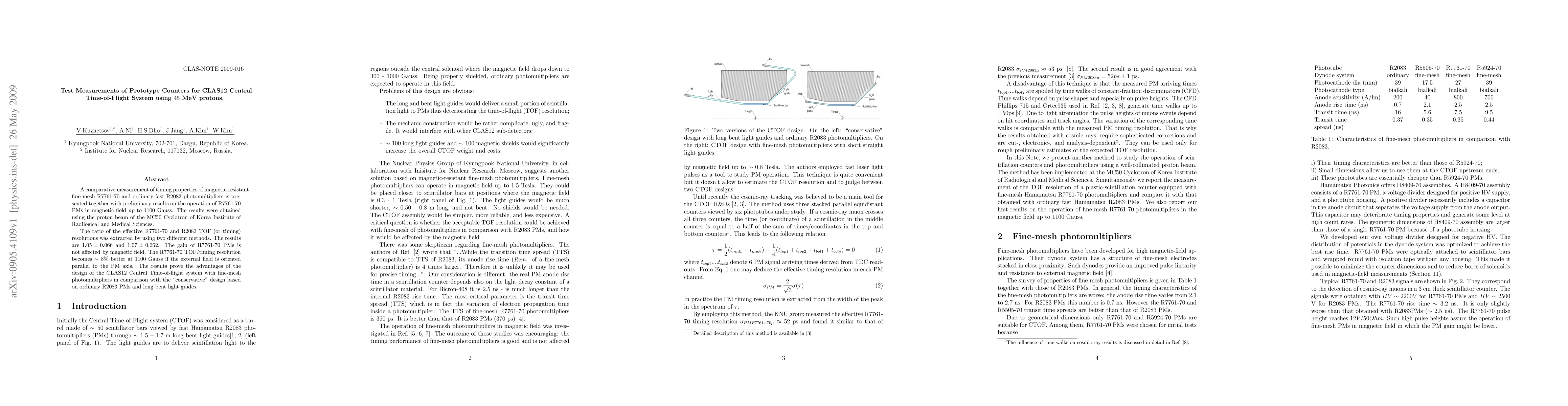 A comparative measurement of timing properties of magnetic-resistant fine mesh R7761-70 and ordinary fast R2083 photomultipliers is presented together with preliminary results on the operation of R7761-70 PMs in magnetic field up to 1100 Gauss. The results were obtained using the proton beam of the MC50 Cyclotron of Korea Institute of Radilogical and Medical Sciences. The ratio of the effective R7761-70 and R2083 TOF (or timing) resolutions was extracted by using two different methods. The results are $1.05\pm 0.066$ and $1.07\pm 0.062$. The gain of R7761-70 PMs is not affected by magnetic field. The R7761-70 TOF/timing resolution becomes $\sim 8%$ better at 1100 Gauss if the external field is oriented parallel to the PM axis. The results prove the advantages of the design of the CLAS12 Central Time-of-flight system with fine-mesh photomultipliers in comparison with the "conservative" design based on ordinary R2083 PMs and long bent light guides.