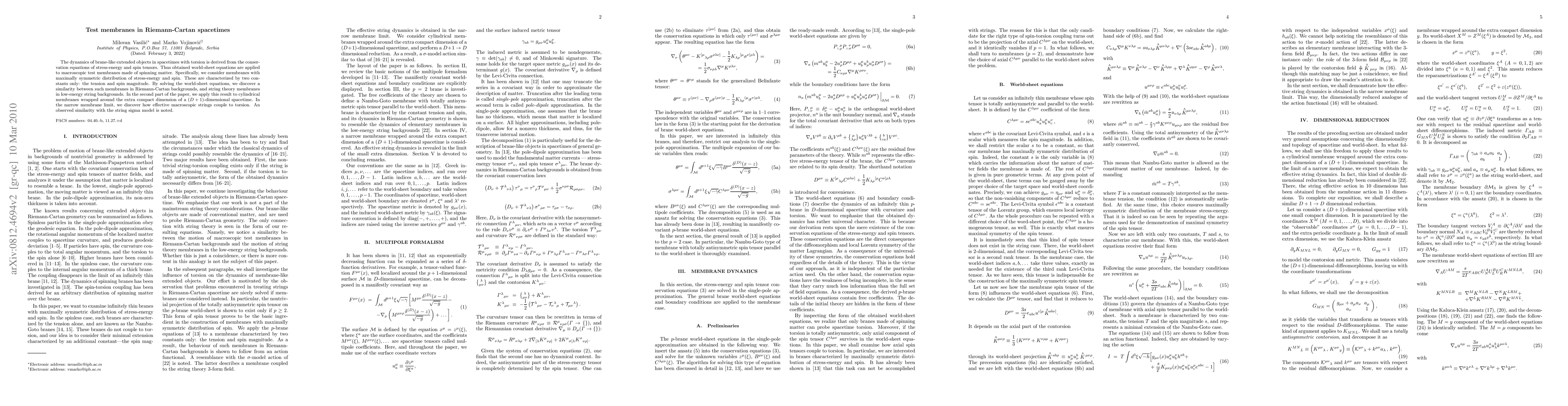 This paper derives the dynamics of spinning membranes in Riemann-Cartan spacetimes with torsion, revealing similarities between these membranes and string theory membranes. It also explores the coupling of effective macroscopic strings to torsion in cylindrical membranes in $(D+1)$-dimensional spacetimes.
