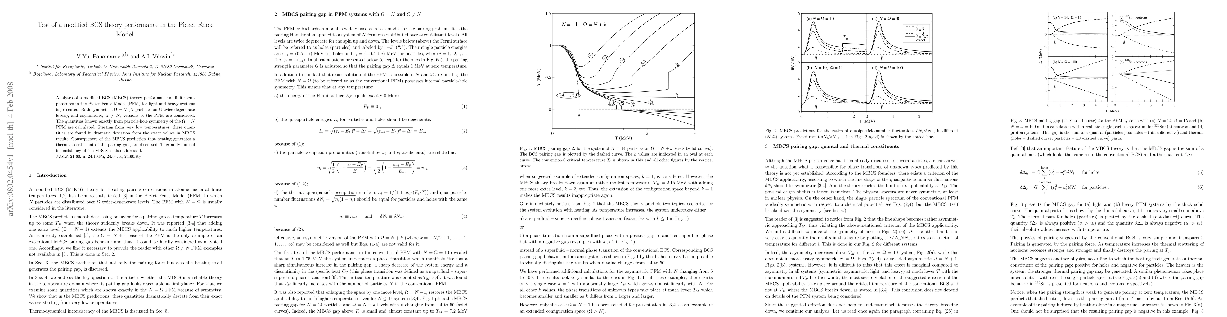 Analyses of a modified BCS (MBCS) theory performance at finite temperatures in the Picket Fence Model (PFM) for light and heavy systems is presented. Both symmetric, $\Omega=N$ ($N$ particles on $\Omega$ twice-degenerate levels), and asymmetric, $\Omega\neq N$, versions of the PFM are considered. The quantities known exactly from particle-hole symmetry of the $\Omega=N$ PFM are calculated. Starting from very low temperatures, these quantities are found in dramatic deviation from the exact values in MBCS results. Consequences of the MBCS prediction that heating generates a thermal constituent of the pairing gap, are discussed. Thermodynamical inconsistency of the MBCS is also addressed.