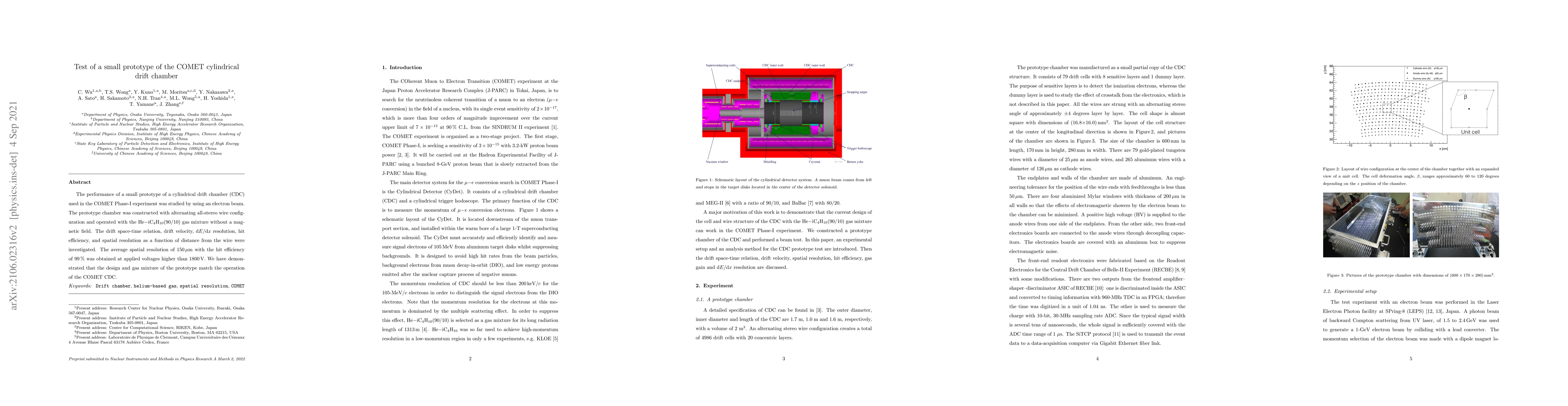 This study evaluated a small prototype of a cylindrical drift chamber for the COMET Phase-I experiment, demonstrating an average spatial resolution of 150 µm and 99% hit efficiency at voltages above 1800 V, confirming the design and gas mixture's suitability for the experiment.