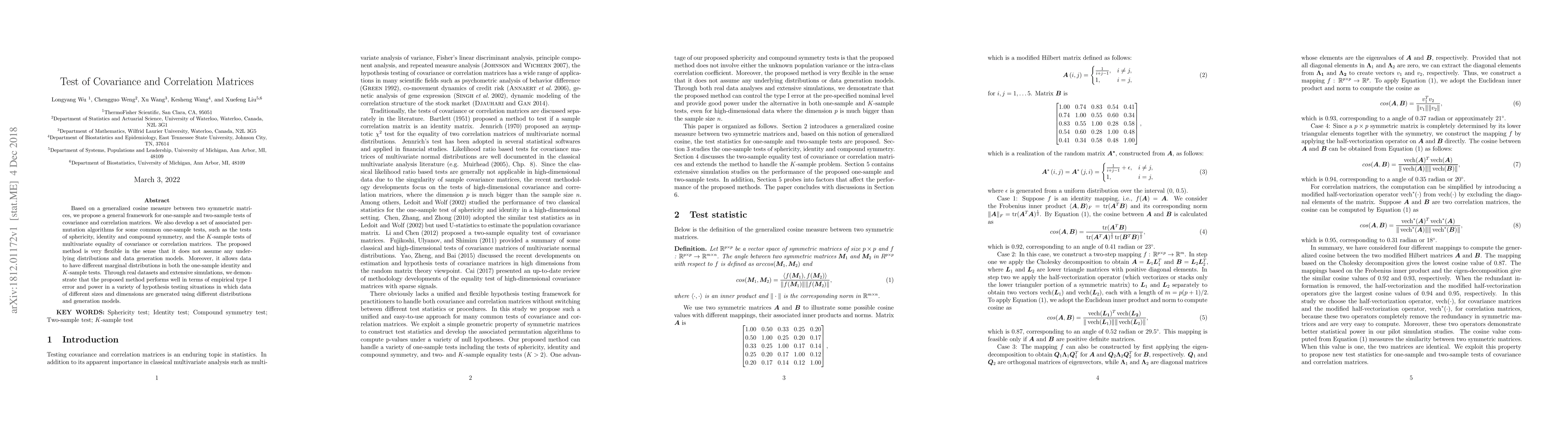 Based on a generalized cosine measure between two symmetric matrices, we propose a general framework for one-sample and two-sample tests of covariance and correlation matrices. We also develop a set of associated permutation algorithms for some common one-sample tests, such as the tests of sphericity, identity and compound symmetry, and the $K$-sample tests of multivariate equality of covariance or correlation matrices. The proposed method is very flexible in the sense that it does not assume any underlying distributions and data generation models. Moreover, it allows data to have different marginal distributions in both the one-sample identity and $K$-sample tests. Through real datasets and extensive simulations, we demonstrate that the proposed method performs well in terms of empirical type I error and power in a variety of hypothesis testing situations in which data of different sizes and dimensions are generated using different distributions and generation models.