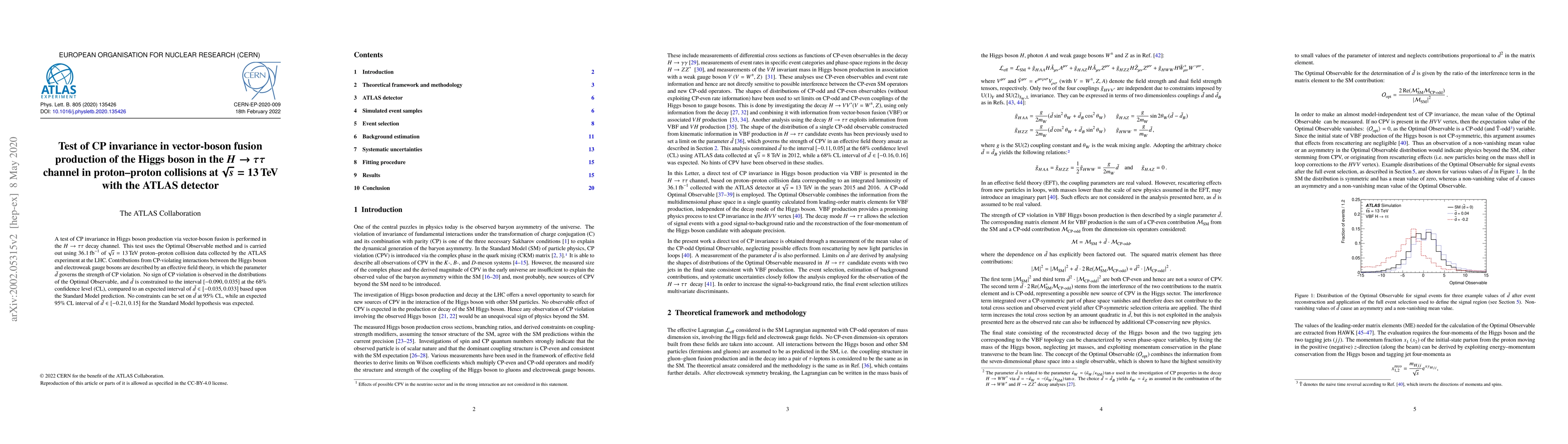 This paper investigates CP invariance in Higgs boson production via vector-boson fusion in the $H\rightarrow\tau\tau$ channel using ATLAS data from 13 TeV proton-proton collisions. No CP violation is observed, constraining $\tilde{d}$ to $[-0.090, 0.035]$ at 68% CL, with no constraints at 95% CL.