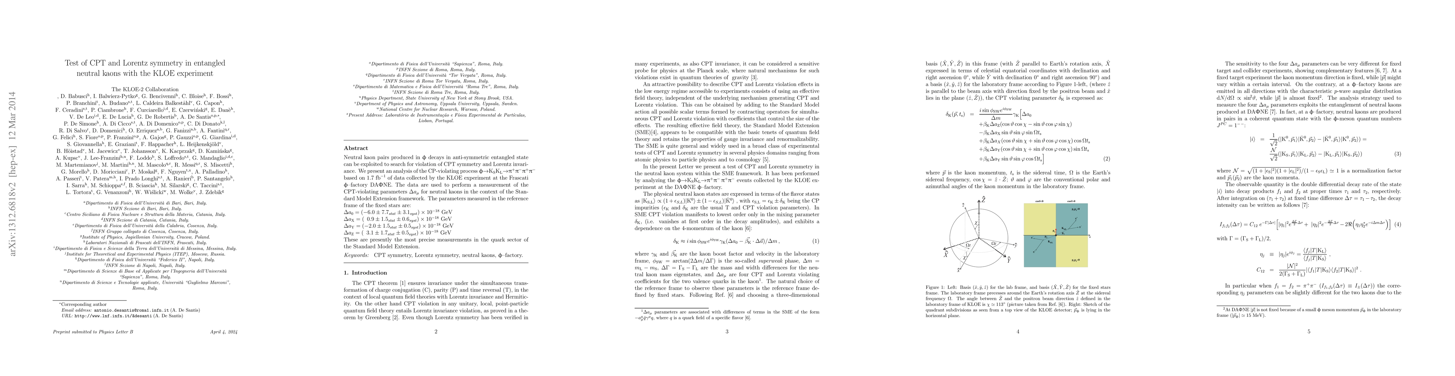 The KLOE experiment analyzed entangled neutral kaons to test CPT symmetry and Lorentz invariance, measuring CP-violating parameters in the Standard Model Extension framework. The results provide the most precise values to date for these parameters in the quark sector.