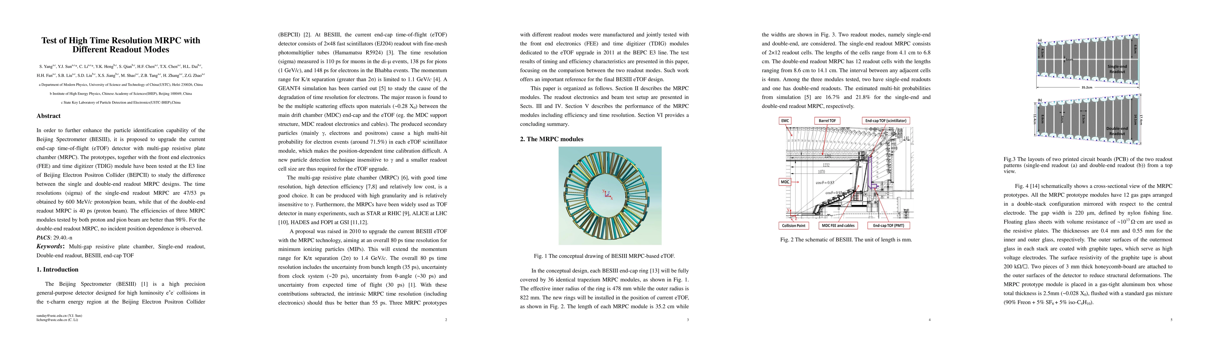 Researchers tested a new MRPC detector with two readout modes at a particle collider, finding that the double-end design improves time resolution to 40 ps, while maintaining high efficiency (>98%) for both proton and pion beams.