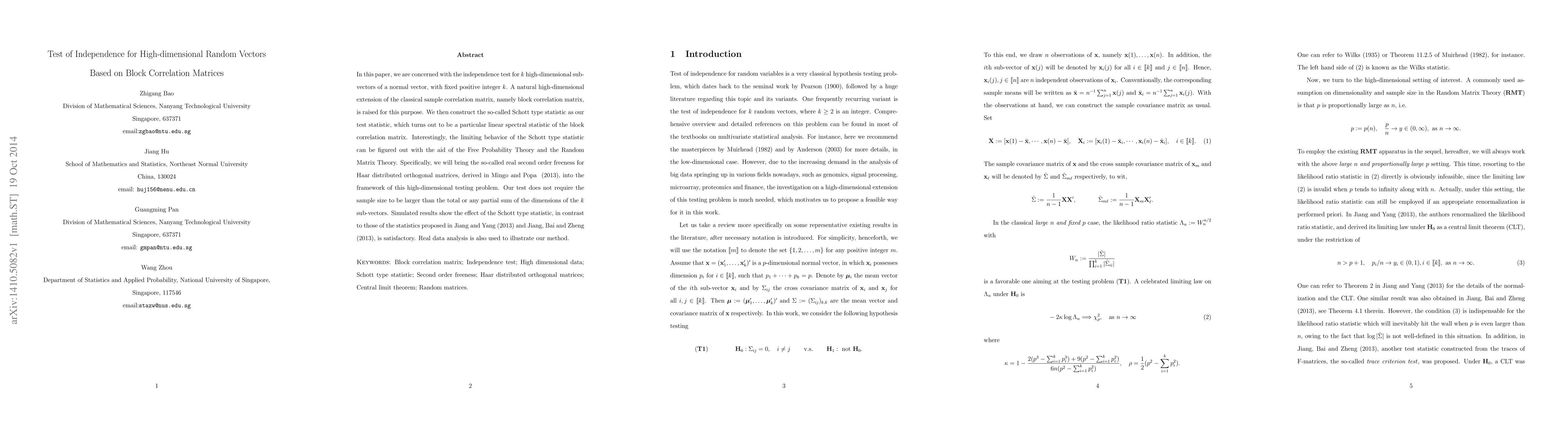 In this paper, we are concerned with the independence test for $k$ high-dimensional sub-vectors of a normal vector, with fixed positive integer $k$. A natural high-dimensional extension of the classical sample correlation matrix, namely block correlation matrix, is raised for this purpose. We then construct the so-called Schott type statistic as our test statistic, which turns out to be a particular linear spectral statistic of the block correlation matrix. Interestingly, the limiting behavior of the Schott type statistic can be figured out with the aid of the Free Probability Theory and the Random Matrix Theory. Specifically, we will bring the so-called real second order freeness for Haar distributed orthogonal matrices, derived in \cite{MP2013}, into the framework of this high-dimensional testing problem. Our test does not require the sample size to be larger than the total or any partial sum of the dimensions of the $k$ sub-vectors. Simulated results show the effect of the Schott type statistic, in contrast to those of the statistics proposed in \cite{JY2013} and \cite{JBZ2013}, is satisfactory. Real data analysis is also used to illustrate our method.