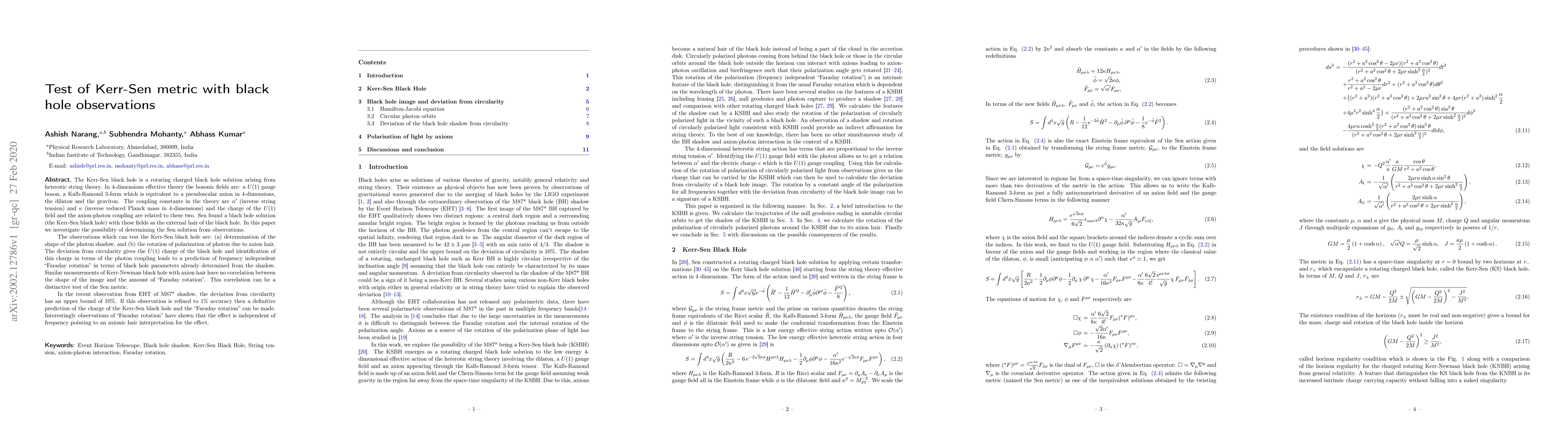 The Kerr-Sen black hole is a rotating charged black hole solution arising from heterotic string theory. In 4-dimensions effective theory the bosonic fields are: a $U(1)$ gauge boson, a Kalb-Ramond 3-form which is equivalent to a pseudoscalar axion in 4-dimensions, the dilaton and the graviton. The coupling constants in the theory are $\alpha^{\prime}$ (inverse string tension) and $\kappa$ (inverse reduced Planck mass in 4-dimensions) and the charge of the $U(1)$ field and the axion-photon coupling are related to these two. Sen found a black hole solution (the Kerr-Sen black hole) with these fields as the external hair of the black hole. In this paper we investigate the possibility of determining the Sen solution from observations. The observations which can test the Kerr-Sen black hole are: (a) determination of the shape of the photon shadow, and (b) the rotation of polarization of photon due to axion hair. The deviation from circularity gives the $U(1)$ charge of the black hole and identification of this charge in terms of the photon coupling leads to a prediction of frequency independent "Faraday rotation" in terms of black hole parameters already determined from the shadow. Similar measurements of Kerr-Newman black hole with axion hair have no correlation between the shape of the image and the amount of "Faraday rotation". This correlation can be a distinctive test of the Sen metric. In the recent observation from EHT of M87* shadow, the deviation from circularity has an upper bound of 10%. If this observation is refined to 1% accuracy then a definitive prediction of the charge of the Kerr-Sen black hole and the "Faraday rotation" can be made. Interestingly observations of "Faraday rotation" have shown that the effect is independent of frequency pointing to an axionic hair interpretation for the effect.