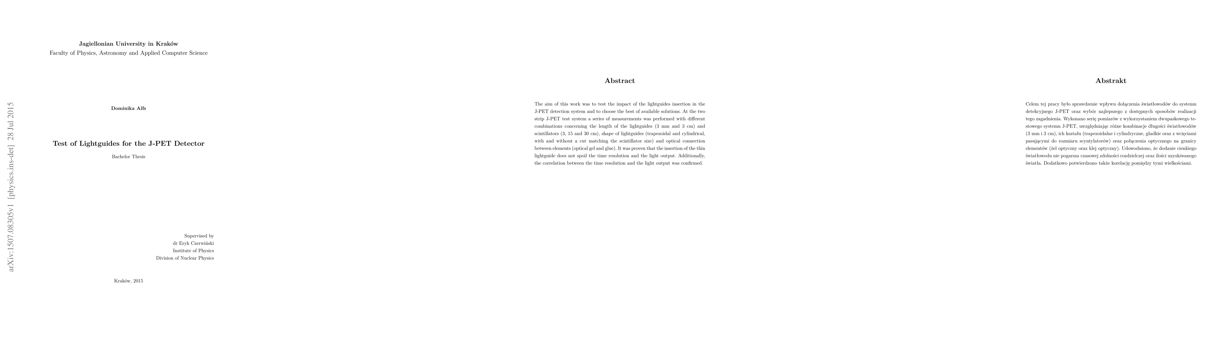 The aim of this work was to test the impact of the lightguides insertion in the J-PET detection system and to choose the best of available solutions. At the two strip J-PET test system a series of measurements was performed with different combinations concerning the length of the lightguides (3 mm and 3 cm) and scintillators (3, 15 and 30 cm), shape of lightguides (trapezoidal and cylindrical, with and without a cut matching the scintillator size) and optical connection between elements (optical gel and glue). It was proven that the insertion of the thin lightguide does not spoil the time resolution and the light output. Additionally,the correlation between the time resolution and the light output was confirmed.
