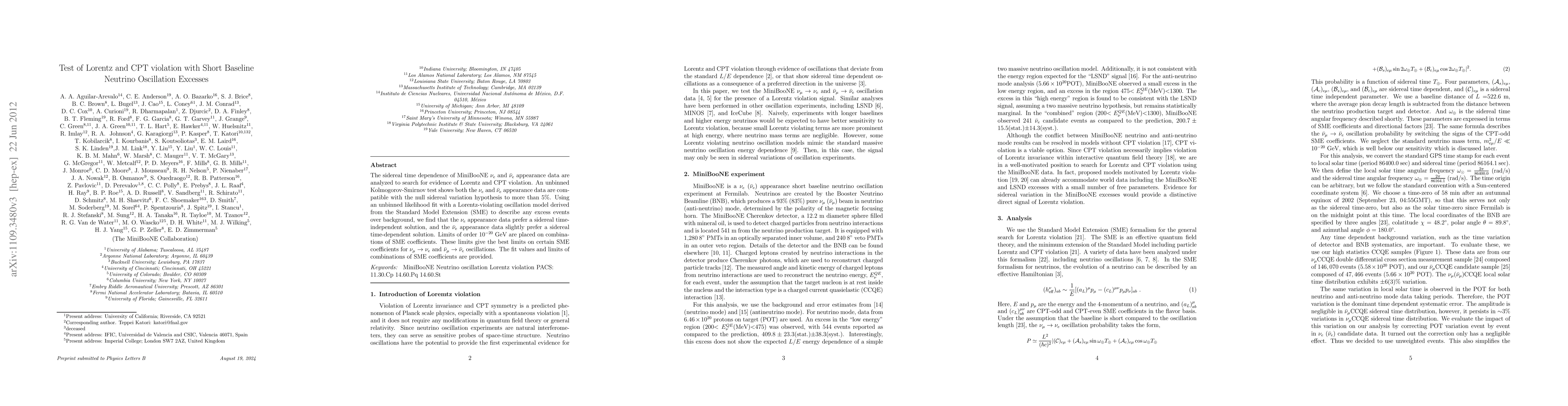 This paper analyzes MiniBooNE data for electron neutrino and anti-electron neutrino oscillations to search for Lorentz and CPT violations, finding no significant sidereal time dependence. It sets stringent limits on certain Standard Model Extension coefficients, providing the best constraints for specific muon neutrino to electron neutrino oscillation parameters.