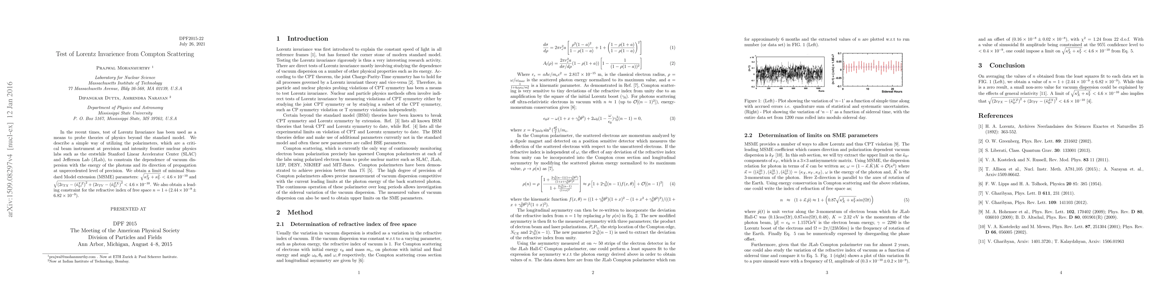 In the recent times, test of Lorentz Invariance has been used as a means to probe theories of physics beyond the standard model. We describe a simple way of utilizing the polarimeters, which are a critical beam instrument at precision and intensity frontier nuclear physics labs such as the erstwhile Stanford Linear Accelerator Center (SLAC) and Jefferson Lab (JLab), to constrain the dependence of vacuum dispersion with the energy of the photons and its direction of propagation at unprecedented level of precision. We obtain a limit of minimal Standard Model extension (MSME) parameters: $\sqrt{\kappa_X^2 + \kappa_Y^2} < 4.6 \times 10^{-10}$ and $\sqrt{\left( 2c_{TX} - (\tilde{\kappa}_{0^+}^{YZ} \right)^2 + \left( 2c_{TY} - (\tilde{\kappa}_{0^+}^{ZX} \right)^2} < 4.6 \times 10^{-10}$. We also obtain a leading constraint for the refractive index of free space $n = 1 + (2.44\times10^{-9} \pm 6.82\times 10^{-9})$.
