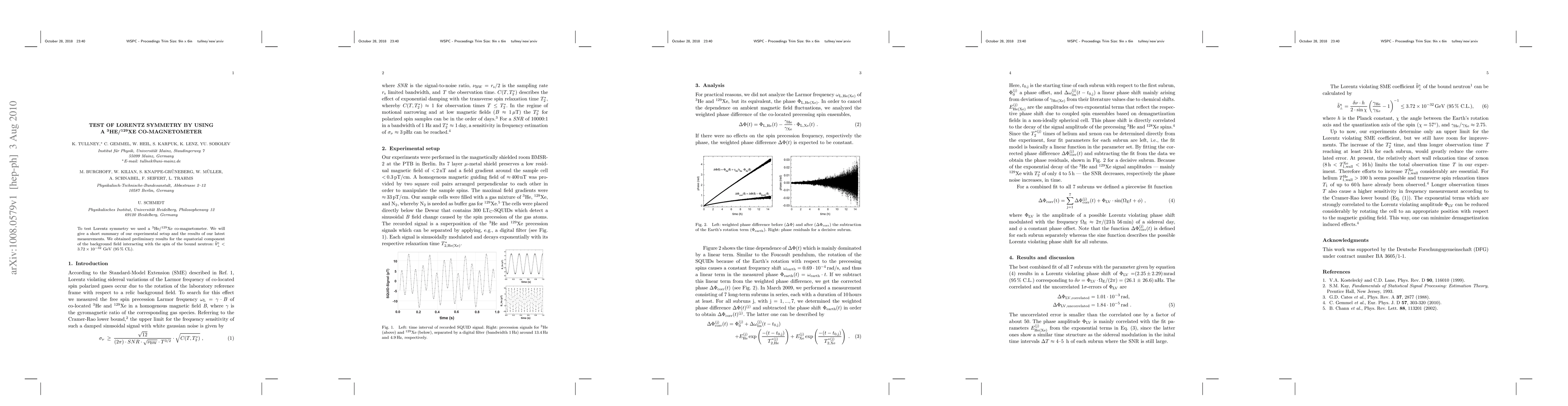 This paper tests Lorentz symmetry using a 3He/129Xe co-magnetometer, reporting preliminary results showing an upper limit of b_n < 3.72 x 10^(-32) GeV for the equatorial component of the background field interacting with the bound neutron spin (95 C.L.).