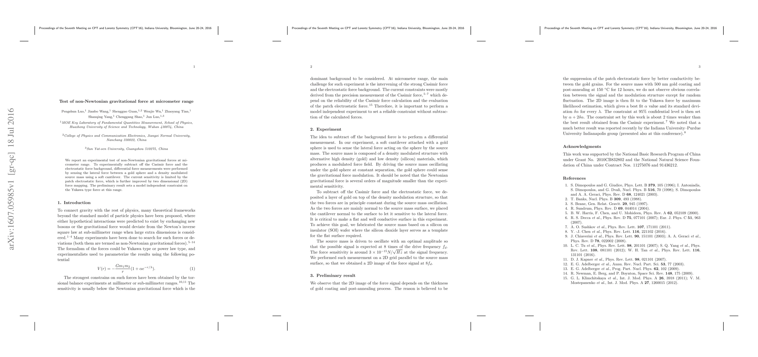 We report an experimental test of non-Newtonian gravitational forces at mi- crometer range. To experimentally subtract off the Casimir force and the electrostatic force background, differential force measurements were performed by sensing the lateral force between a gold sphere and a density modulated source mass using a soft cantilever. The current sensitivity is limited by the patch electrostatic force, which is further improved by two dimensional (2D) force mapping. The preliminary result sets a model independent constraint on the Yukawa type force at this range.