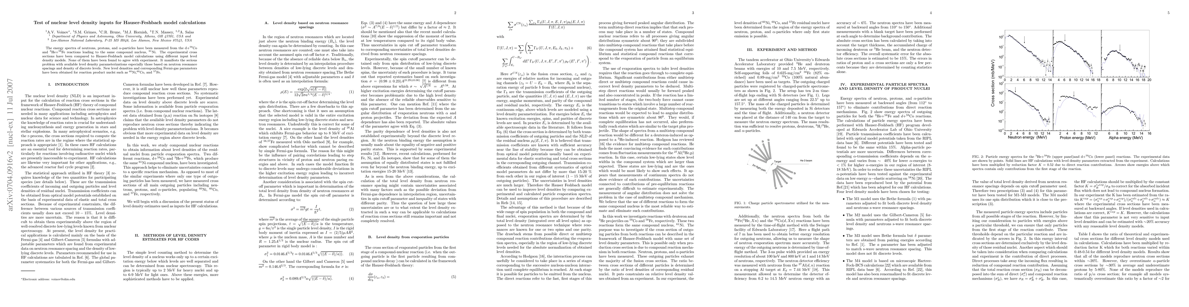 Researchers tested Hauser-Feshbach model calculations against experimental data from neutron and alpha-particle reactions, finding none of the input level density models agreed with the results. They obtained new level densities for relevant nuclei to address this issue.