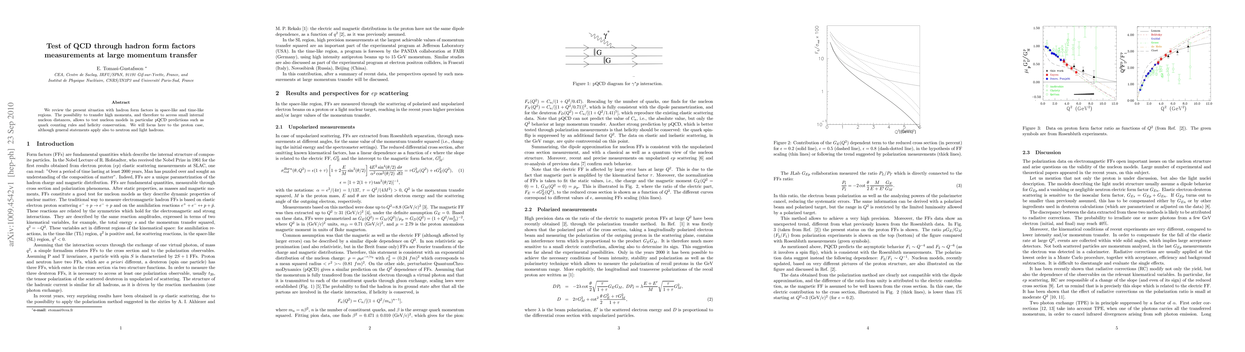 This paper reviews the current state of hadron form factors measurements, emphasizing the use of high momentum transfers to probe small nucleon distances and test Quantum Chromodynamics (QCD) predictions, particularly focusing on proton form factors but with general implications for neutrons and light hadrons.
