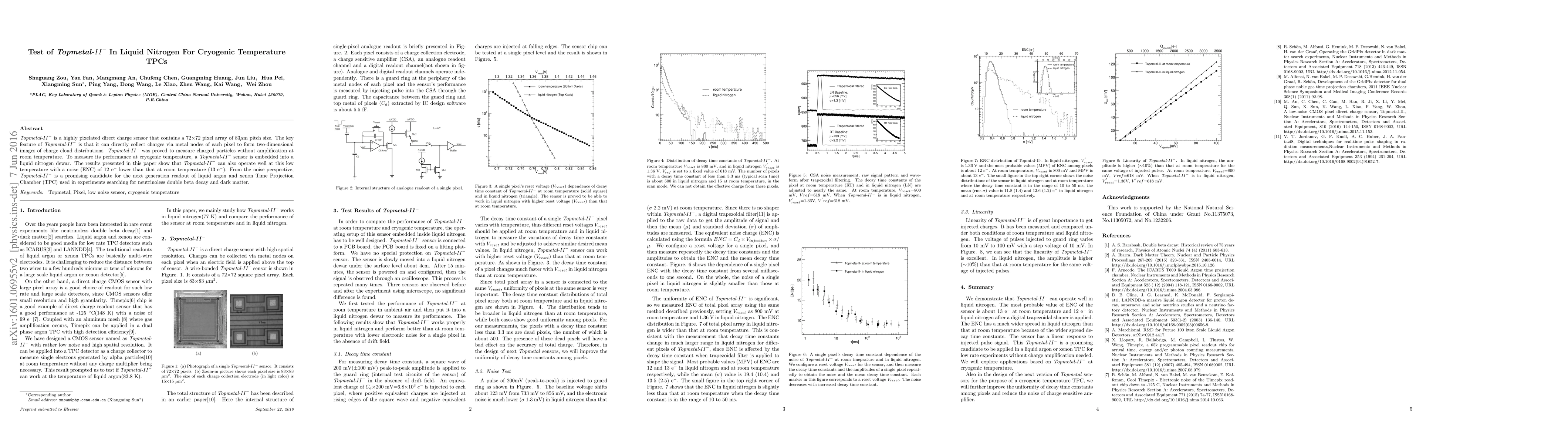 This paper tests the performance of the \textit{Topmetal-${II}^-$} sensor at cryogenic temperatures in liquid nitrogen, finding it operates effectively with lower noise compared to room temperature, making it a promising candidate for next-generation readouts in neutrinoless double beta decay and dark matter experiments.
