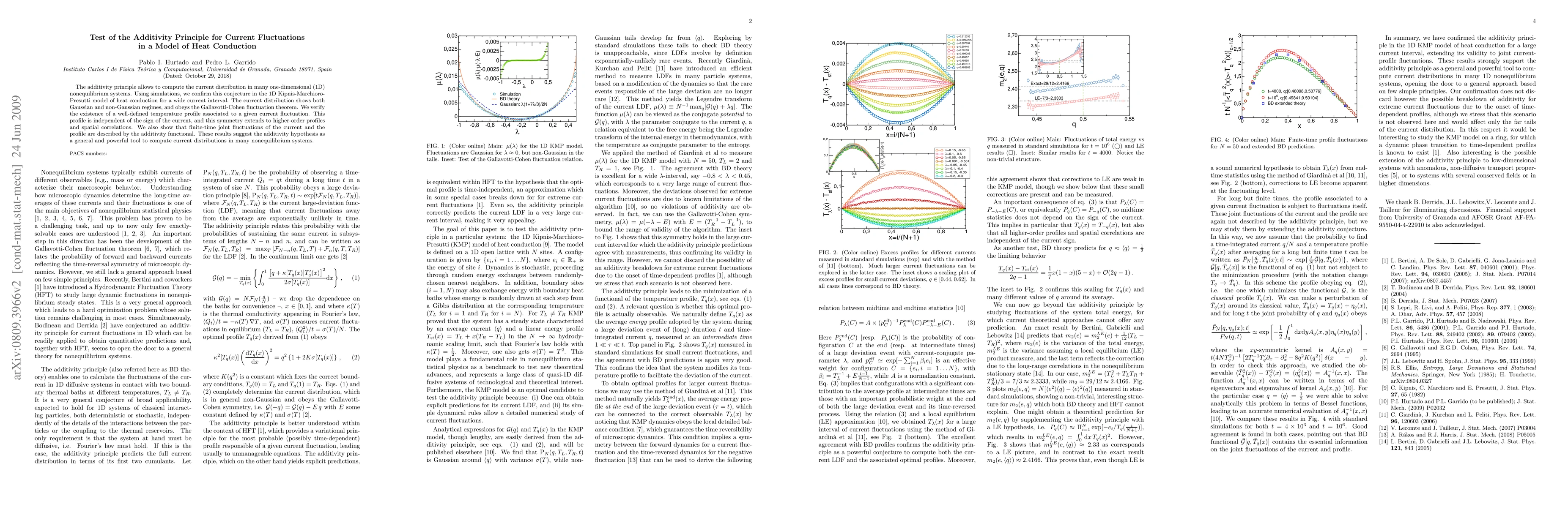 The study confirms the additivity principle in the 1D Kipnis-Marchioro-Presutti model of heat conduction, demonstrating its applicability across Gaussian and non-Gaussian current regimes. It reveals a well-defined temperature profile for current fluctuations, independent of current direction, and validates the additivity functional for finite-time joint fluctuations.