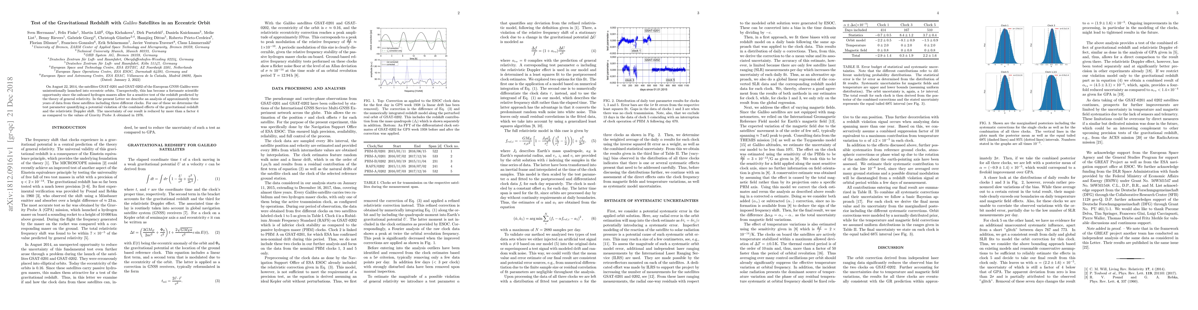 On August 22, 2014, the satellites GSAT-0201 and GSAT-0202 of the European GNSS Galileo were unintentionally launched into eccentric orbits. Unexpectedly, this has become a fortunate scientific opportunity since the onboard hydrogen masers allow for a sensitive test of the redshift predicted by the theory of general relativity. In the present Letter we describe an analysis of approximately three years of data from these satellites including three different clocks. For one of these we determine the test parameter quantifying a potential violation of the combined effects of the gravitational redshift and the relativistic Doppler shift. The uncertainty of our result is reduced by more than a factor 4 as compared to the values of Gravity Probe A obtained in 1976.