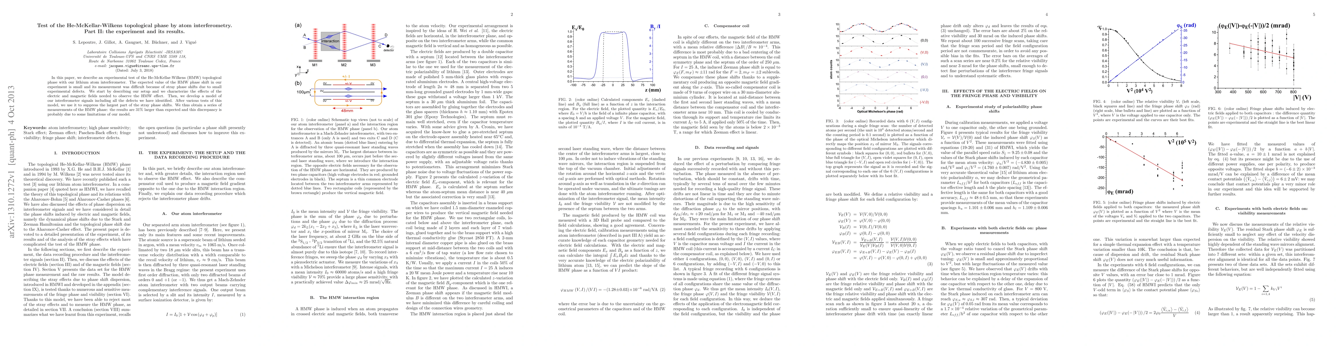 In this paper, we describe an experimental test of the He-McKellar-Wilkens (HMW) topological phase with our lithium atom interferometer. The expected value of the HMW phase shift in our experiment is small and its measurement was difficult because of stray phase shifts due to small experimental defects. We start by describing our setup and we characterize the effects of the electric and magnetic fields needed to observe the HMW effect. Then, we develop a model of our interferometer signals including all the defects we have identified. After various tests of this model, we use it to suppress the largest part of the stray phase shifts. We thus obtain a series of measurements of the HMW phase: the results are 31% larger than expected and this discrepancy is probably due to some limitations of our model.
