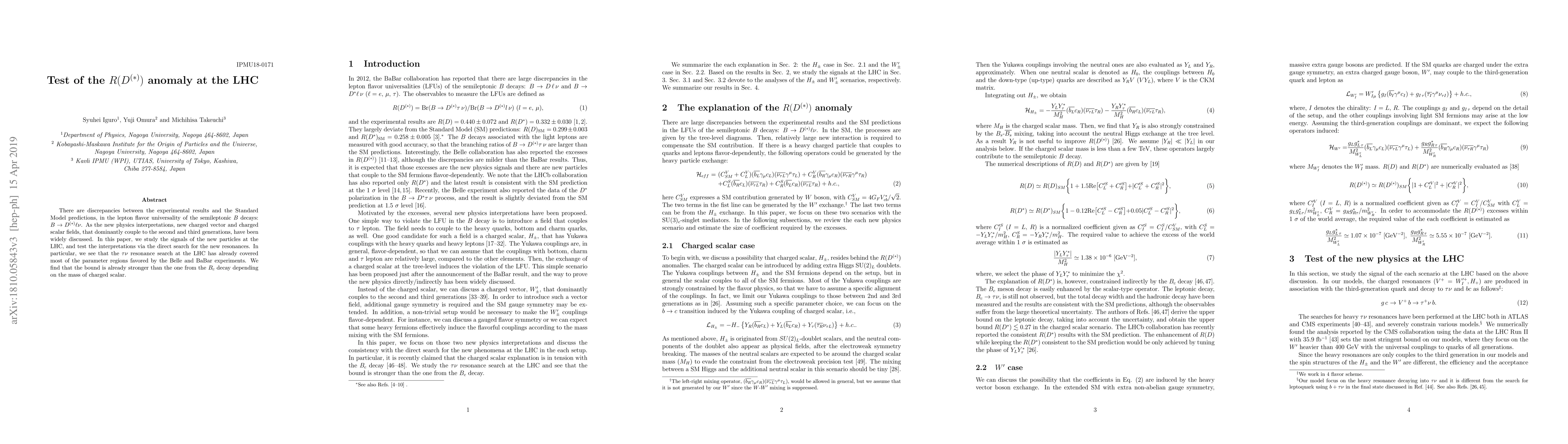 The paper presents a detailed analysis of charged scalar and vector field models to explain the $R(D^{(*)})$ anomaly, utilizing LHC $ au u$ resonance searches for direct validation.