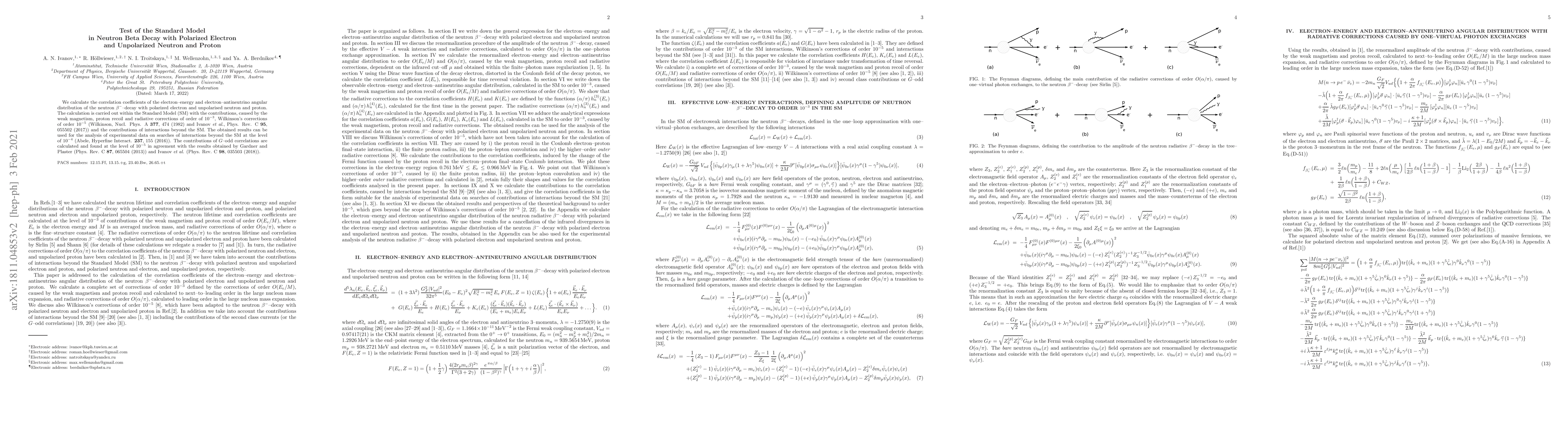 This paper calculates correlation coefficients in neutron beta decay within the Standard Model, including weak magnetism, proton recoil, and radiative corrections, to analyze potential interactions beyond the Standard Model. The results provide a benchmark for experimental searches at the 10^{-4} level.
