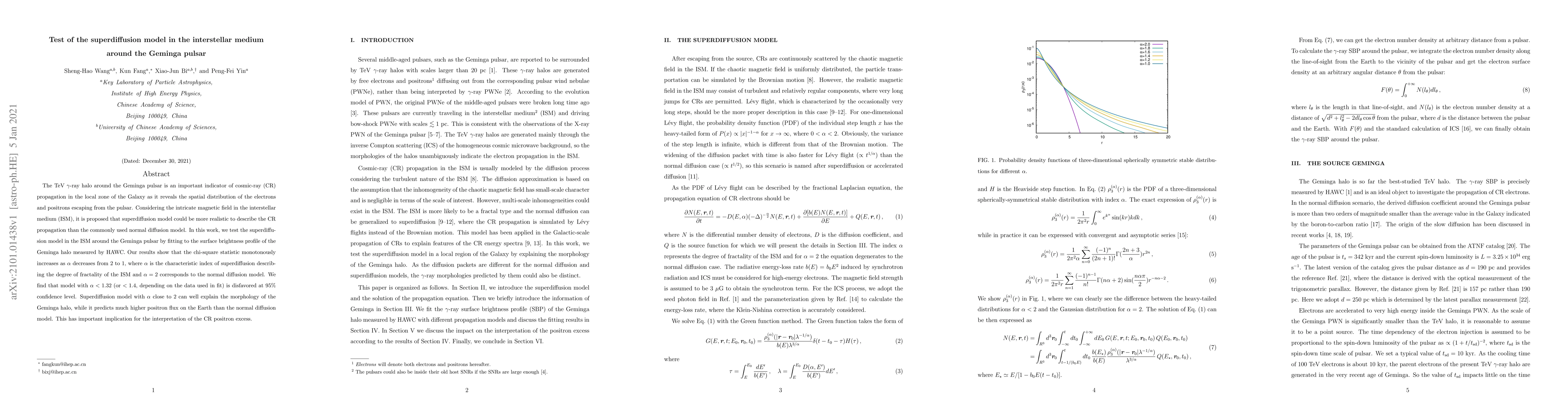 The TeV $\gamma$-ray halo around the Geminga pulsar is an important indicator of cosmic-ray (CR) propagation in the local zone of the Galaxy as it reveals the spatial distribution of the electrons and positrons escaping from the pulsar. Considering the intricate magnetic field in the interstellar medium (ISM), it is proposed that superdiffusion model could be more realistic to describe the CR propagation than the commonly used normal diffusion model. In this work, we test the superdiffusion model in the ISM around the Geminga pulsar by fitting to the surface brightness profile of the Geminga halo measured by HAWC. Our results show that the chi-square statistic monotonously increases as $\alpha$ decreases from 2 to 1, where $\alpha$ is the characteristic index of superdiffusion describing the degree of fractality of the ISM and $\alpha=2$ corresponds to the normal diffusion model. We find that model with $\alpha<1.32$ (or $<1.4$, depending on the data used in fit) is disfavored at 95\% confidence level. Superdiffusion model with $\alpha$ close to 2 can well explain the morphology of the Geminga halo, while it predicts much higher positron flux on the Earth than the normal diffusion model. This has important implication for the interpretation of the CR positron excess.