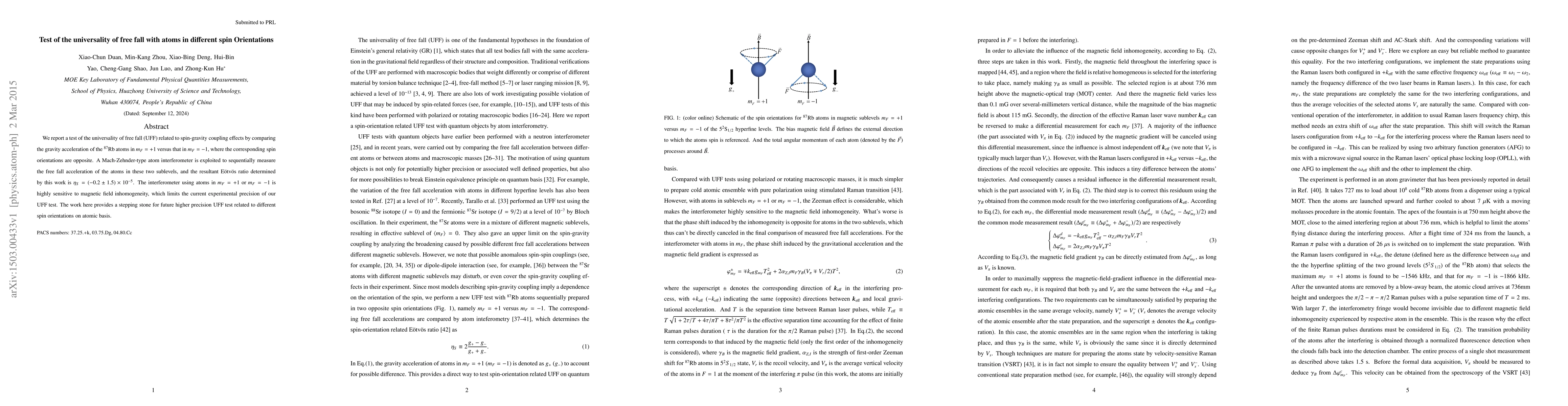 This paper tests the universality of free fall (UFF) by comparing the gravitational acceleration of $^{87}$Rb atoms in opposite spin orientations using a Mach-Zehnder interferometer. The E$\rm{\ddot{o}}$tv$\rm{\ddot{o}}$s ratio obtained is ${\eta_S} =(-0.2\pm1.5)\times 10^{-5}$, indicating no significant spin-gravity coupling effect, but magnetic field inhomogeneity limits current precision.
