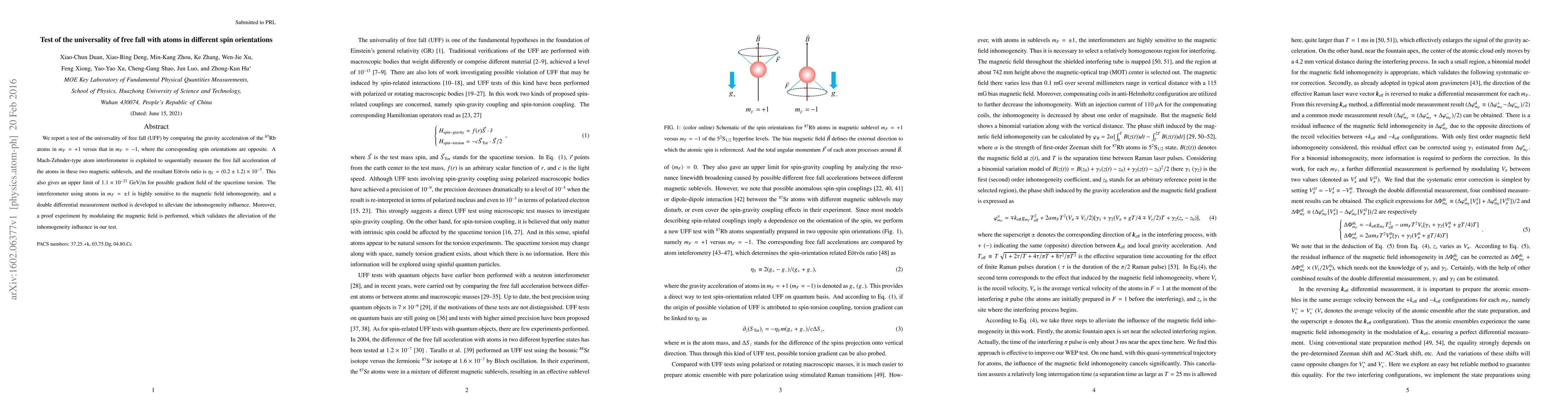 We report a test of the universality of free fall (UFF) by comparing the gravity acceleration of the $^{87}$Rb atoms in $m_F=+1$ versus that in $m_F=-1$, where the corresponding spin orientations are opposite. A Mach-Zehnder-type atom interferometer is exploited to sequentially measure the free fall acceleration of the atoms in these two magnetic sublevels, and the resultant E$\rm{\ddot{o}}$tv$\rm{\ddot{o}}$s ratio is ${\eta _S} =(0.2\pm1.2)\times 10^{-7}$. This also gives an upper limit of $1.1\times 10^{-21}$ GeV/m for possible gradient field of the spacetime torsion. The interferometer using atoms in $m_F=\pm 1$ is highly sensitive to the magnetic field inhomogeneity, and a double differential measurement method is developed to alleviate the inhomogeneity influence. Moreover, a proof experiment by modulating the magnetic field is performed, which validates the alleviation of the inhomogeneity influence in our test.
