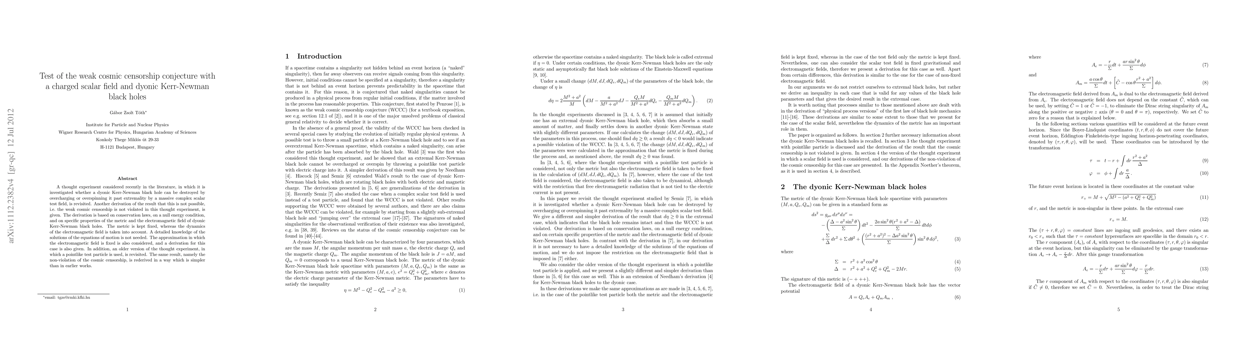 A thought experiment considered recently in the literature, in which it is investigated whether a dyonic Kerr-Newman black hole can be destroyed by overcharging or overspinning it past extremality by a massive complex scalar test field, is revisited. Another derivation of the result that this is not possible, i.e. the weak cosmic censorship is not violated in this thought experiment, is given. The derivation is based on conservation laws, on a null energy condition, and on specific properties of the metric and the electromagnetic field of dyonic Kerr-Newman black holes. The metric is kept fixed, whereas the dynamics of the electromagnetic field is taken into account. A detailed knowledge of the solutions of the equations of motion is not needed. The approximation in which the electromagnetic field is fixed is also considered, and a derivation for this case is also given. In addition, an older version of the thought experiment, in which a pointlike test particle is used, is revisited. The same result, namely the non-violation of the cosmic censorship, is rederived in a way which is simpler than in earlier works.